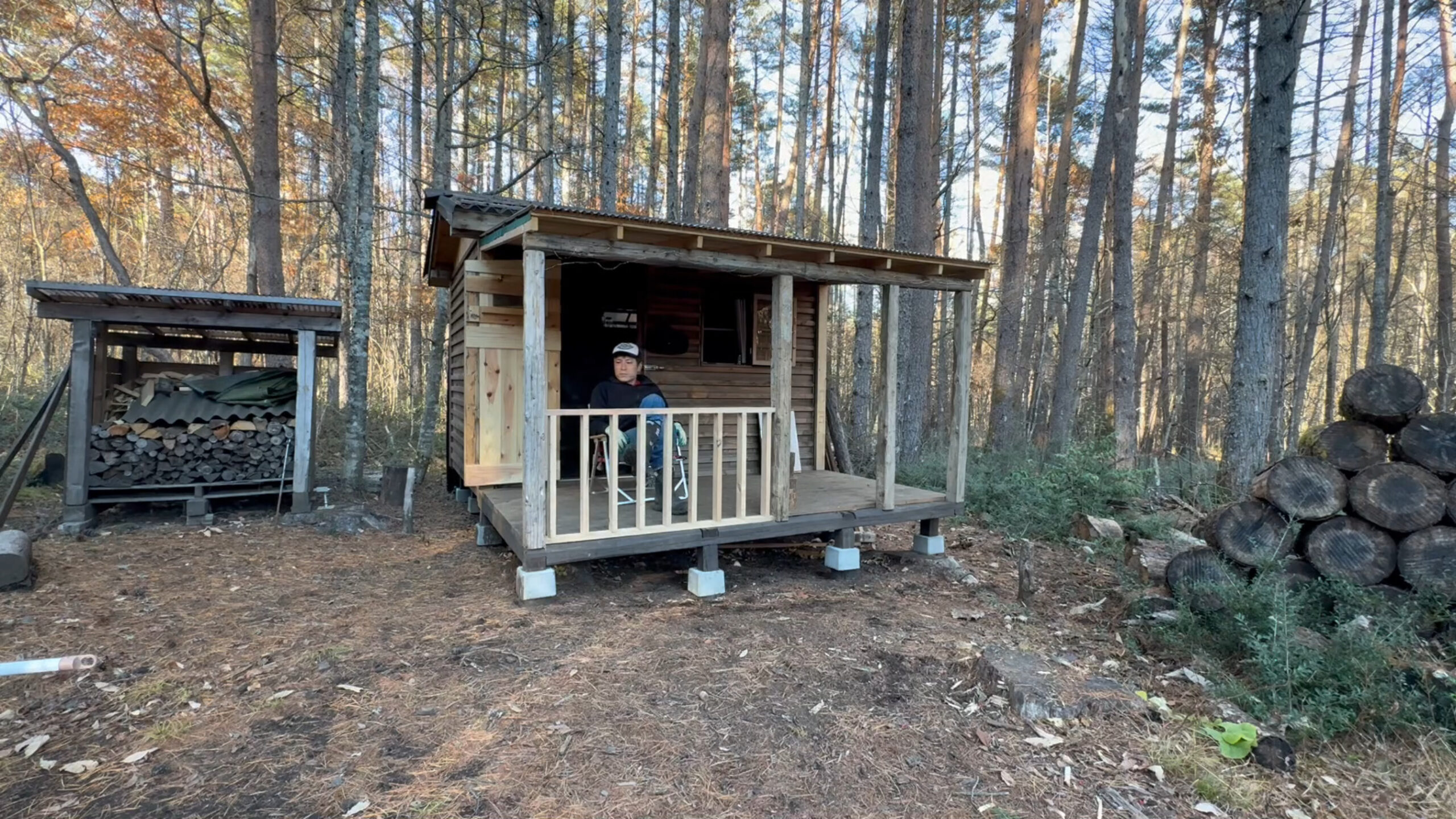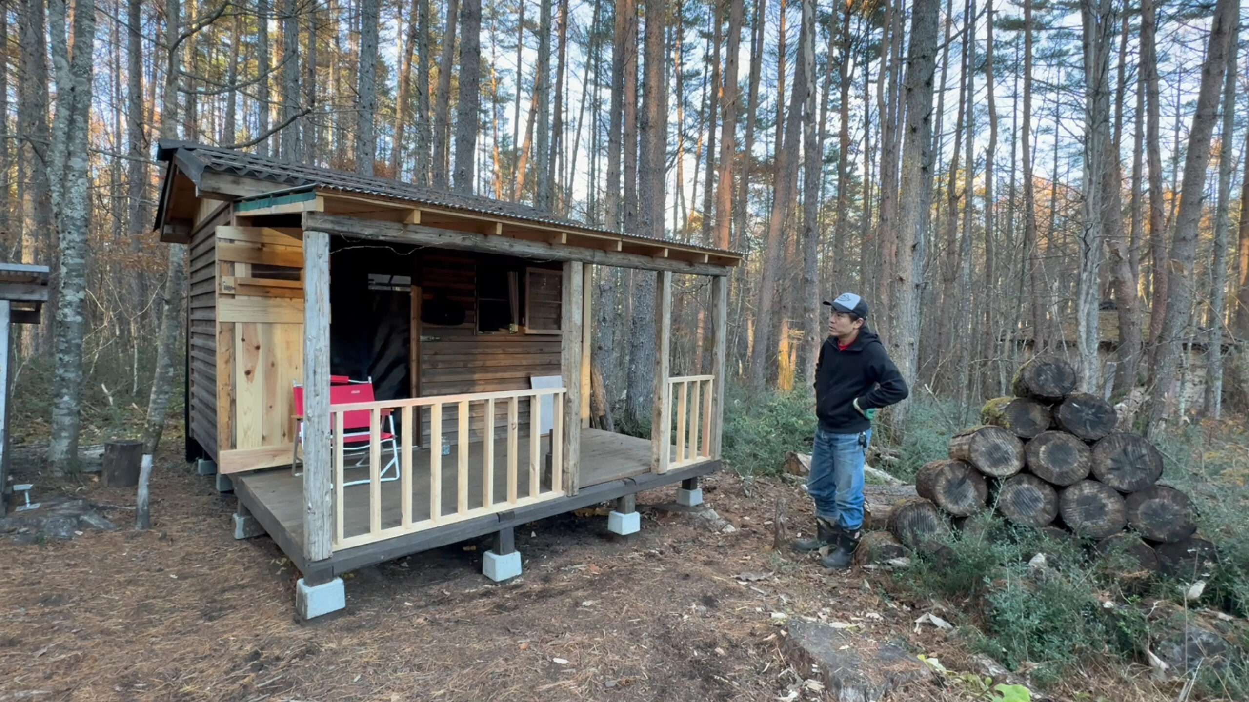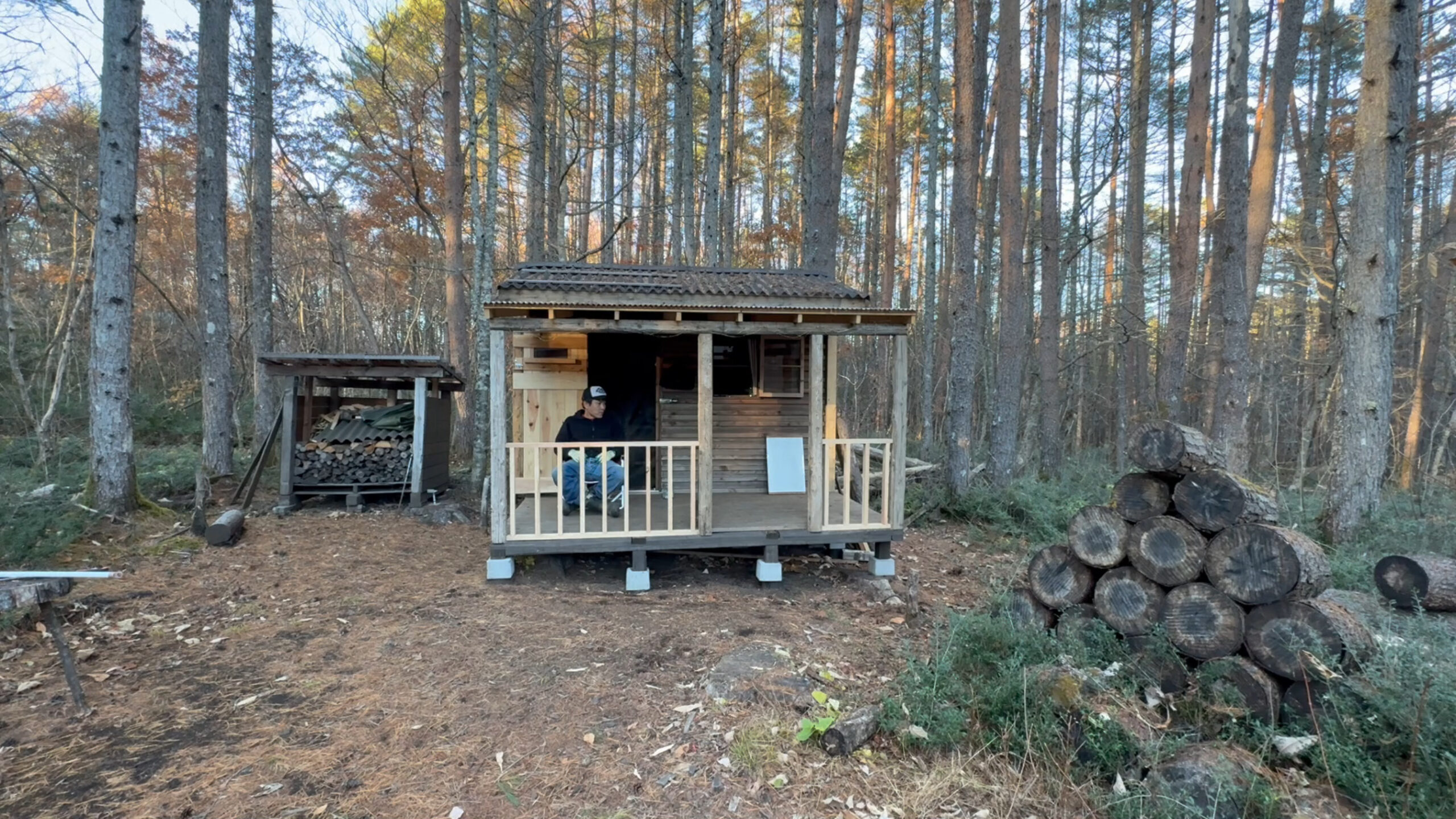 2020年の8月に開拓をスタートして、物置小屋、薪棚、雨水貯水システム、そして寝泊まり出来る小さな小さな山小屋を建てました。