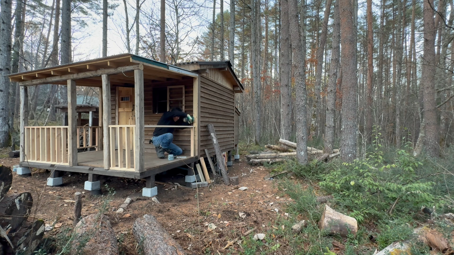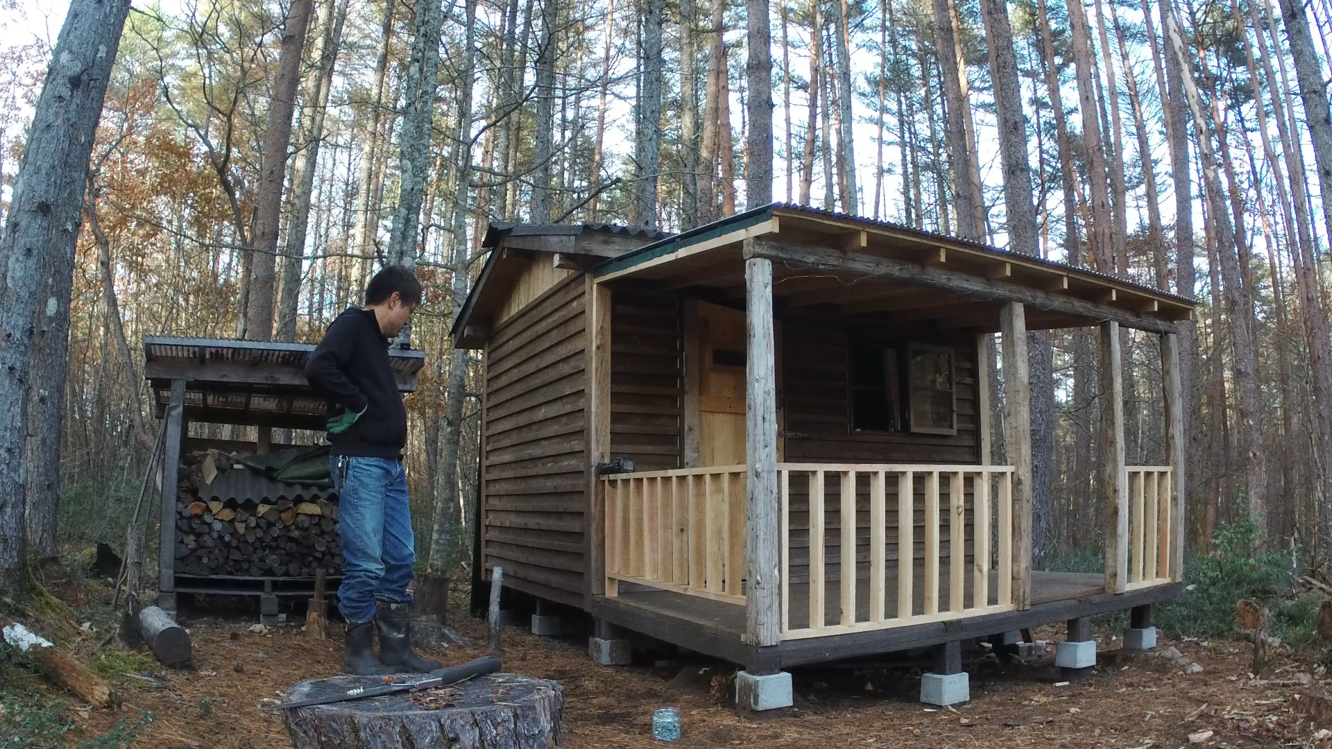 2020年の8月に開拓をスタートして、物置小屋、薪棚、雨水貯水システム、そして寝泊まり出来る小さな小さな山小屋を建てました。