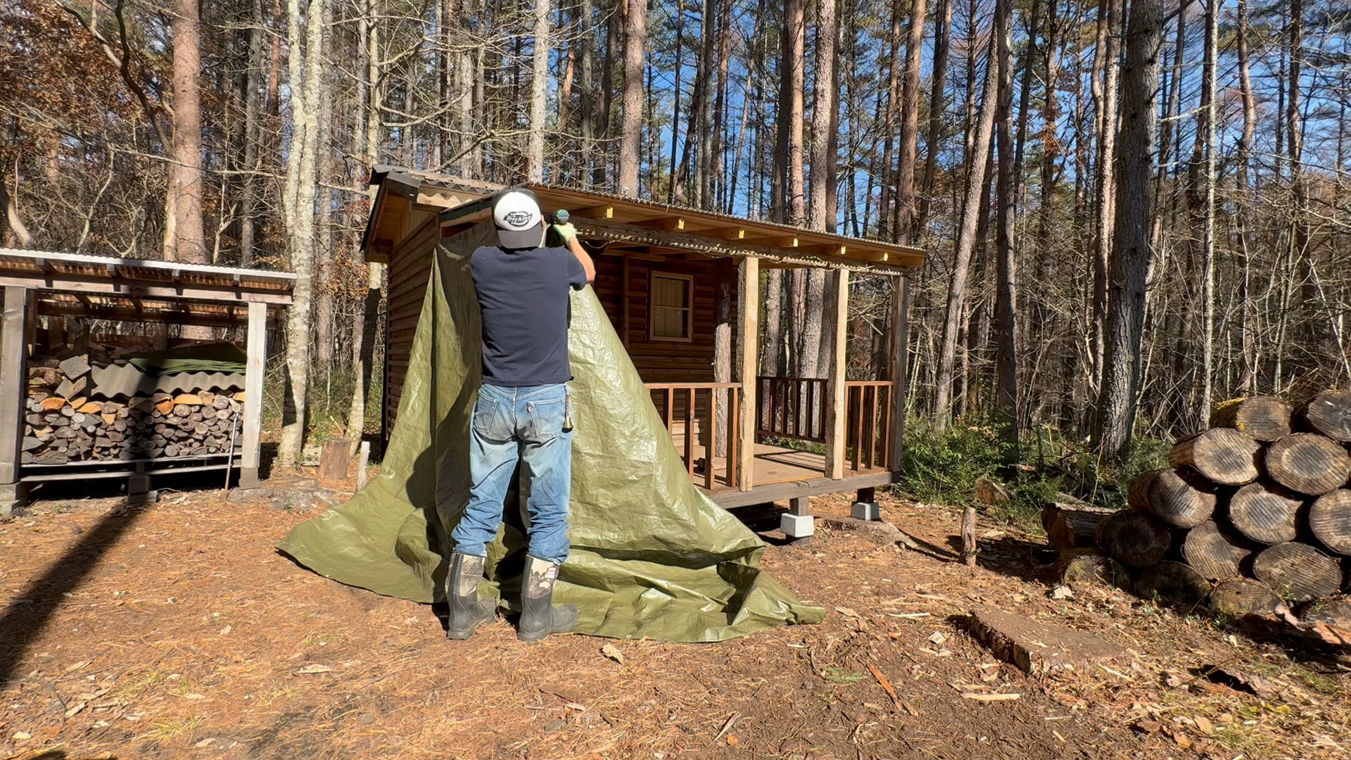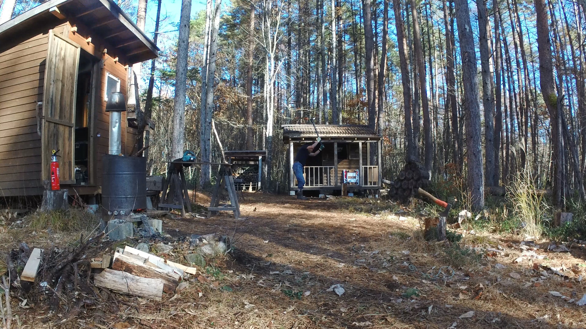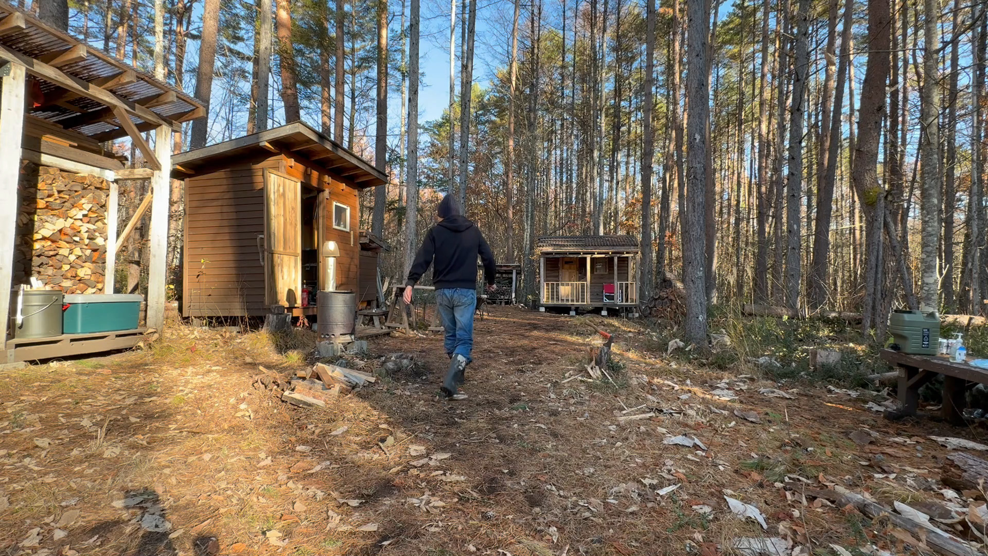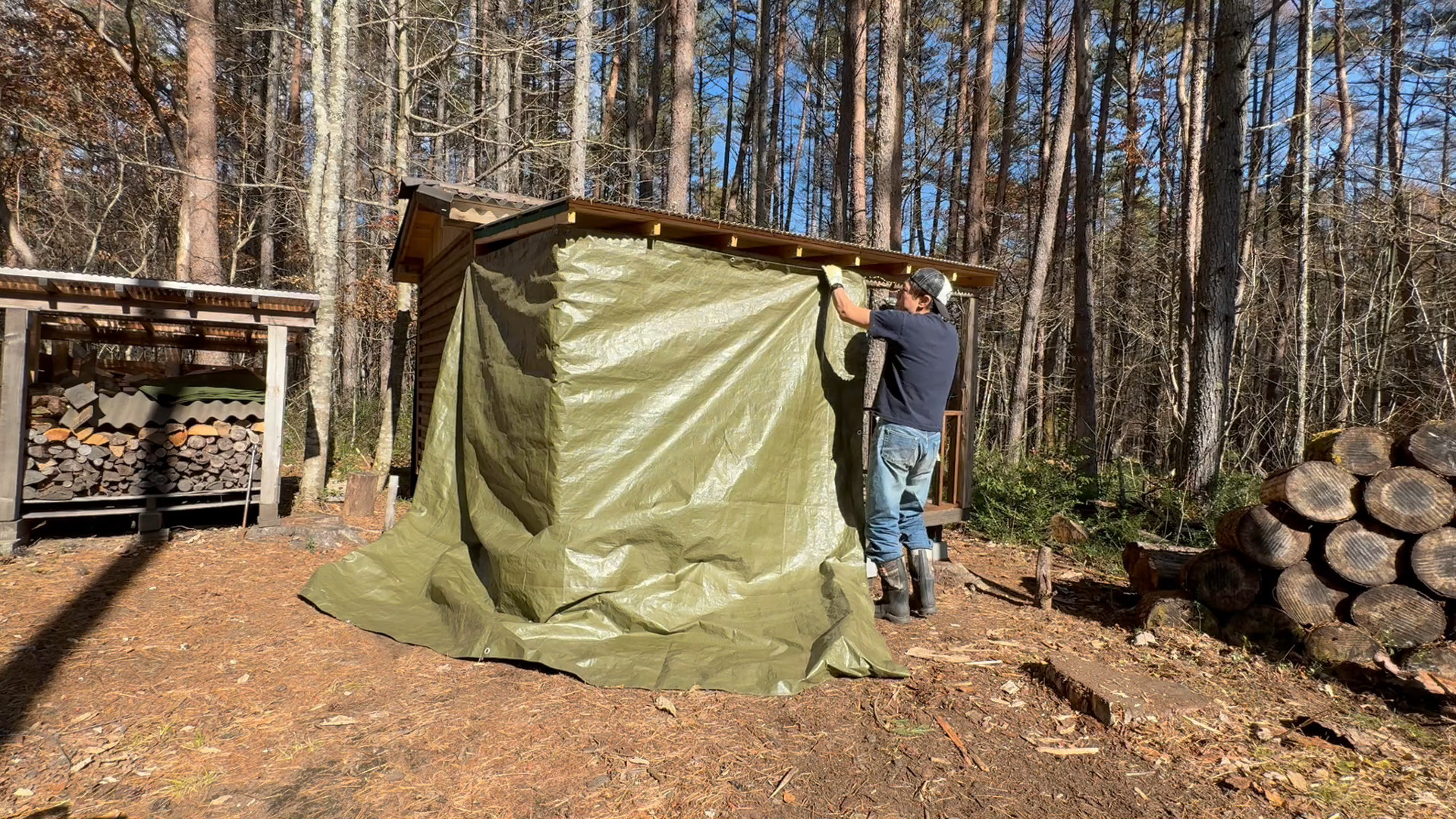 2020年の8月に開拓をスタートして、物置小屋、薪棚、雨水貯水システム、そして寝泊まり出来る小さな小さな山小屋を建てました。