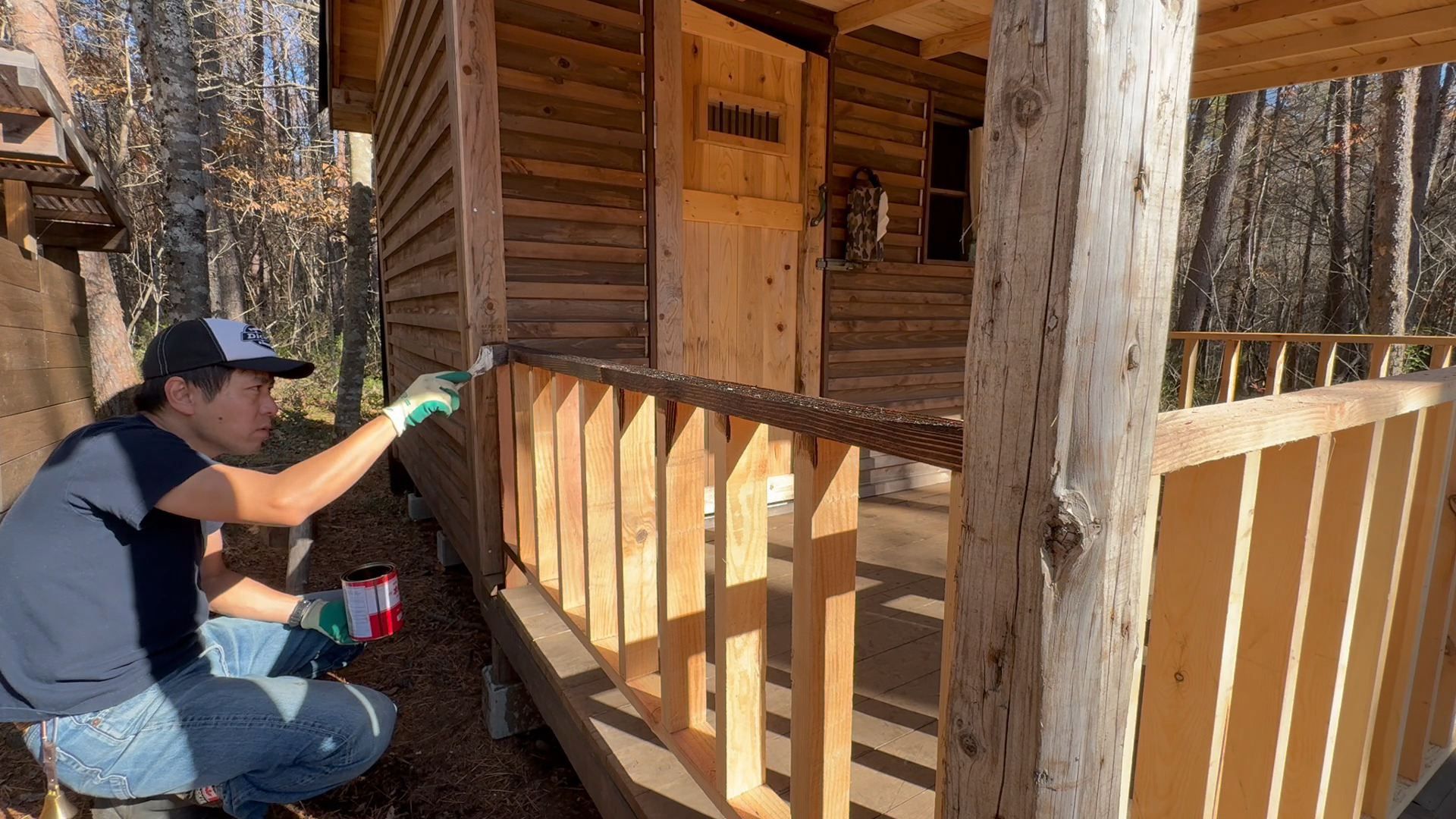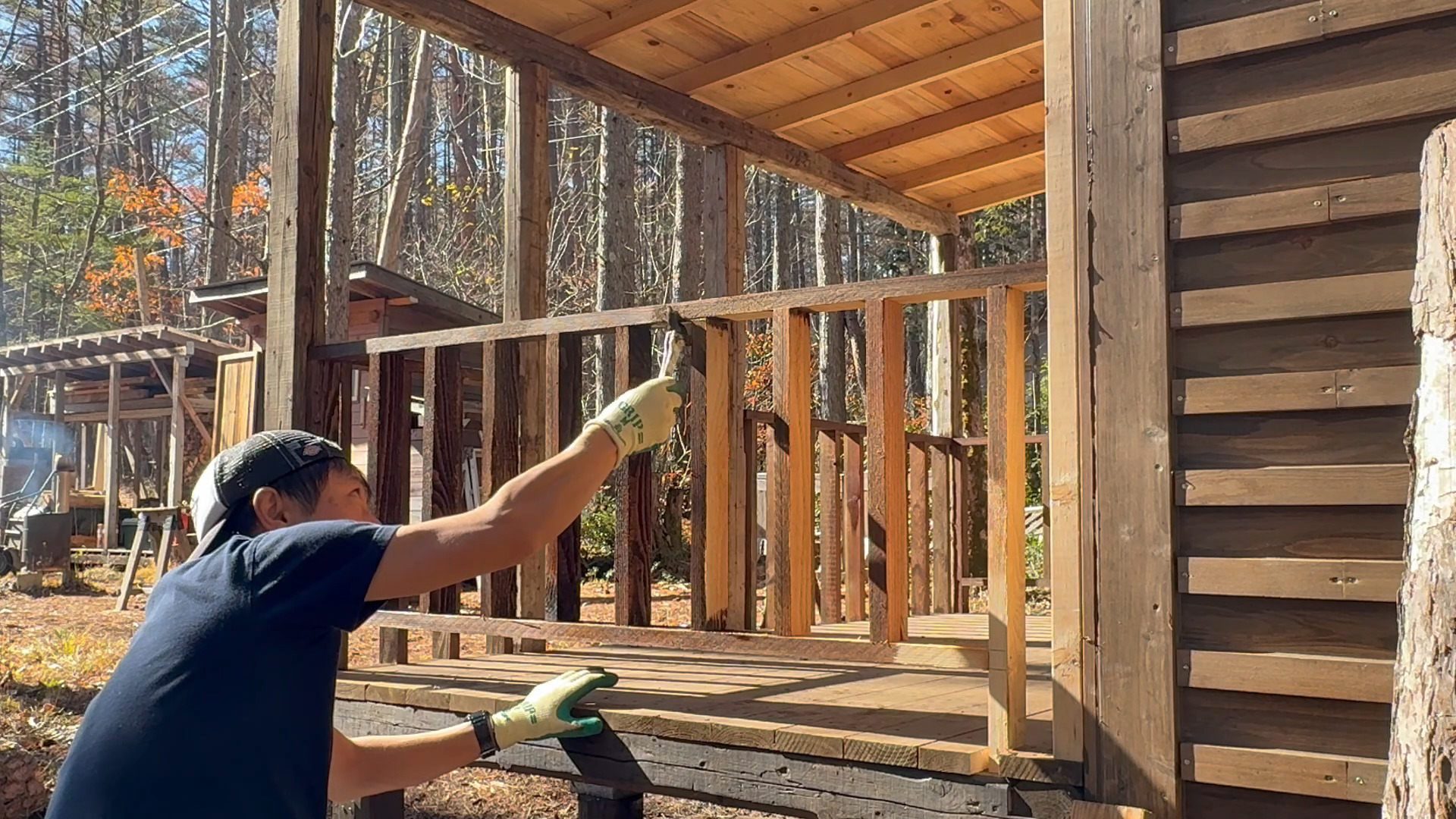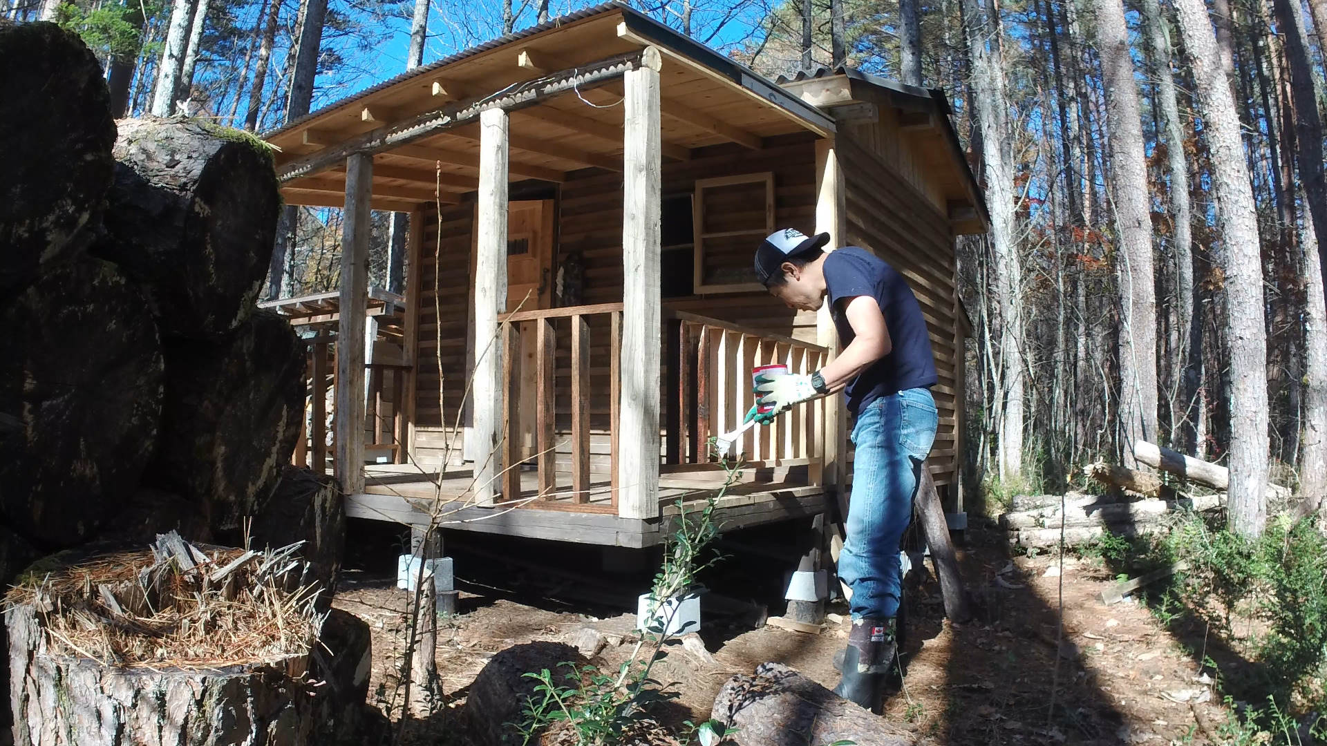 前回に引き続き今回も山小屋に増築した屋根付きウッドデッキの柵の製作で柵に塗装をしたのでその様子をお送りしたいと思います。