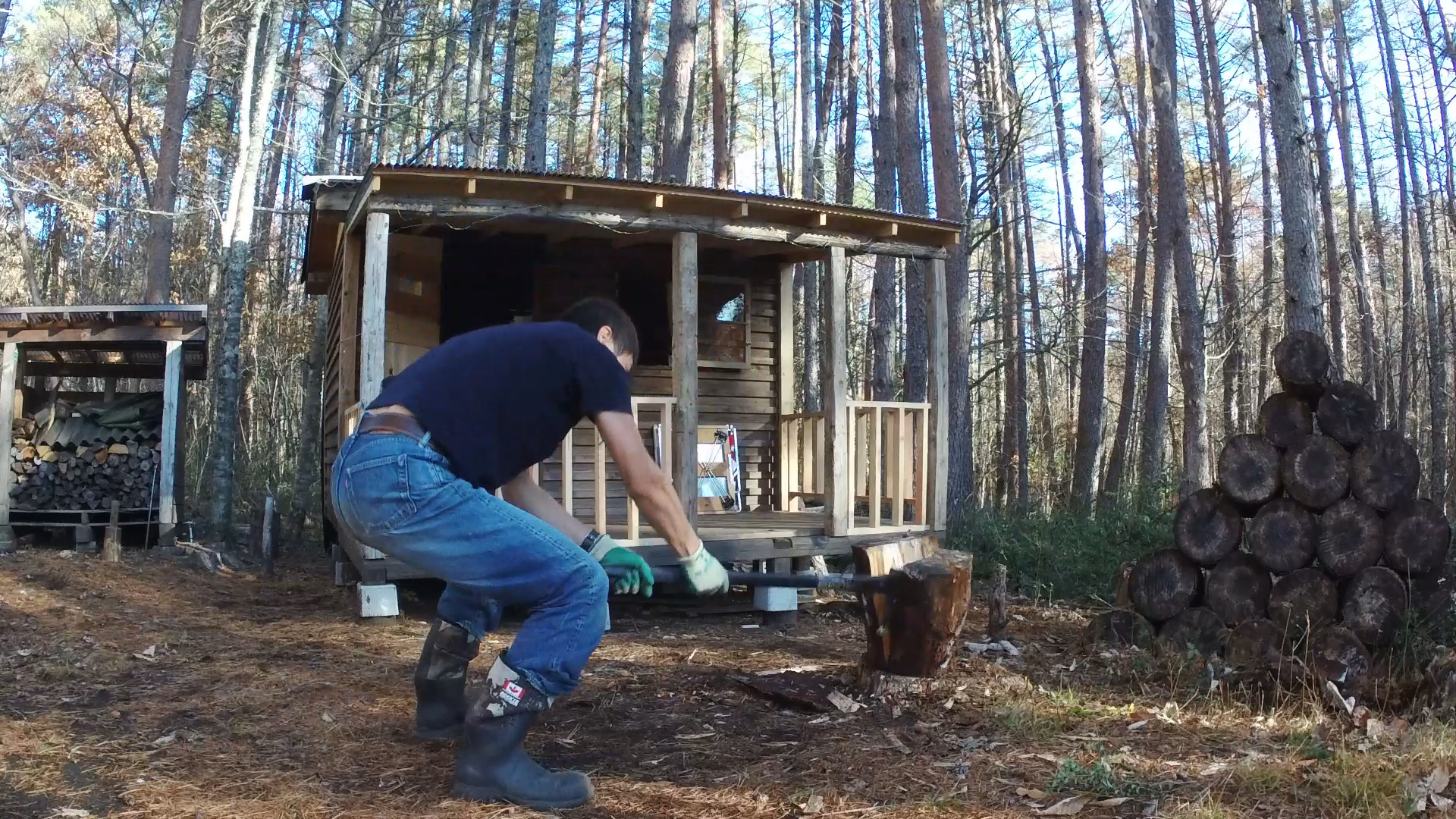 一枚脱いで薪割り開始です。