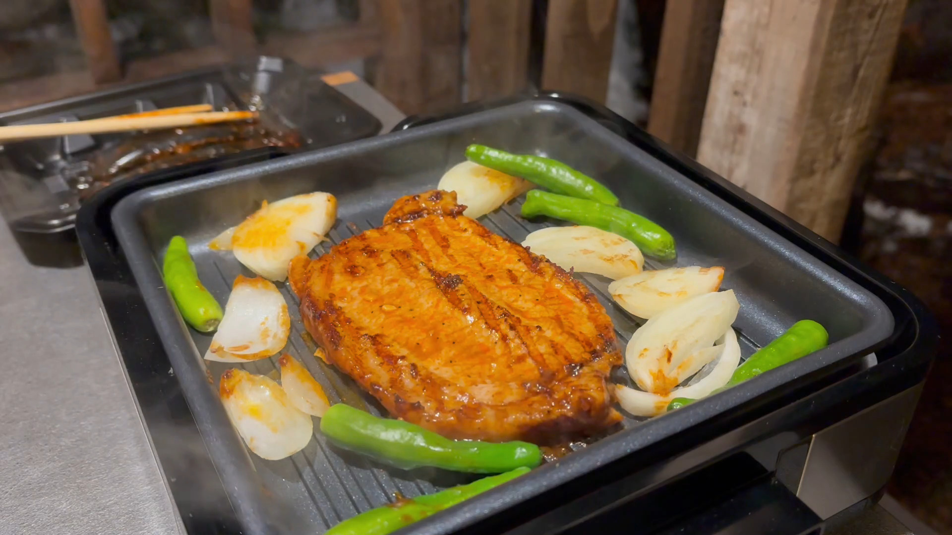 肉焼きプレートでトンテキを焼き焼き…
