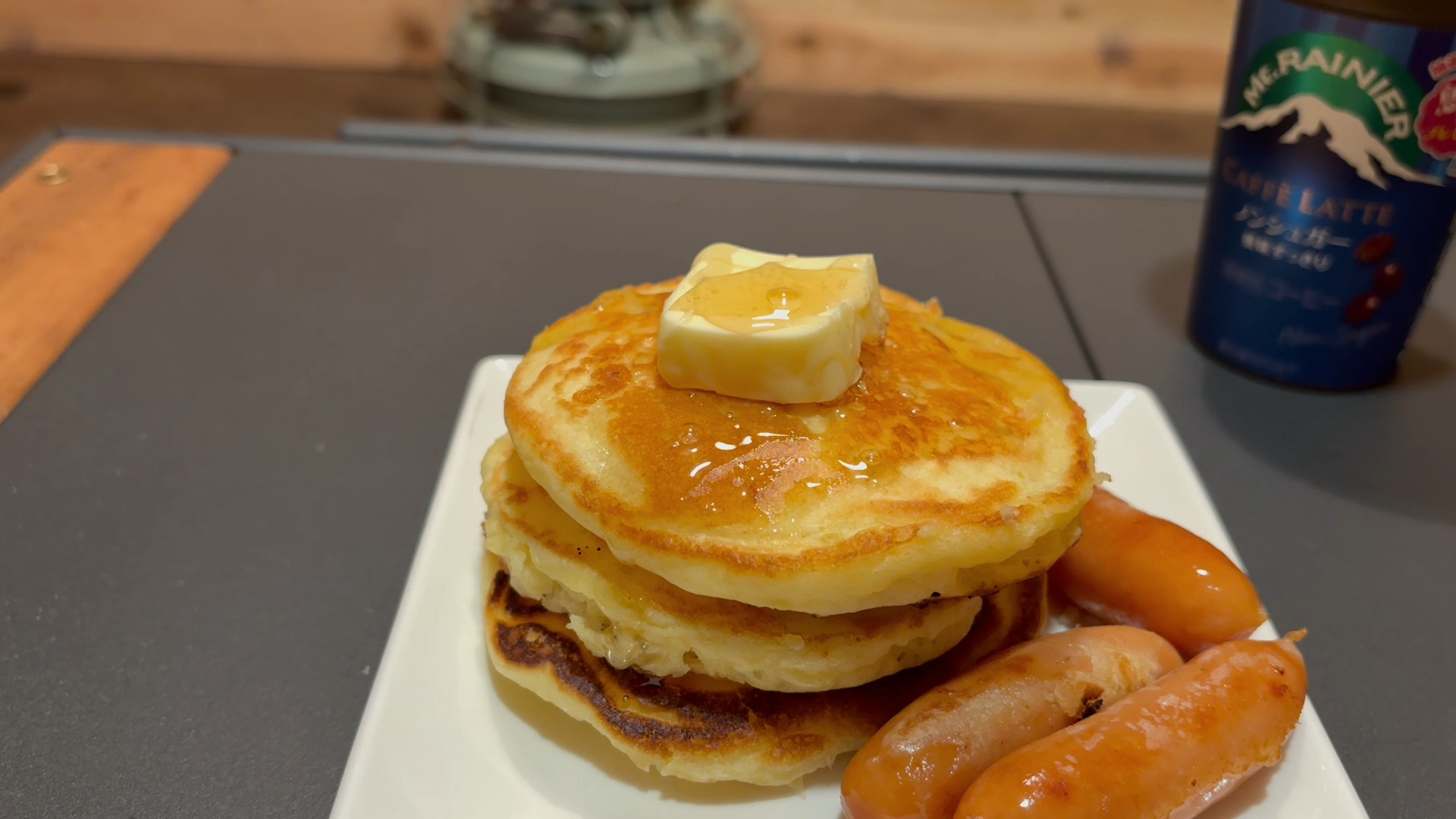 ウインナー添えてバターを乗せてハチミツ掛けて…美味しそうに出来ました。