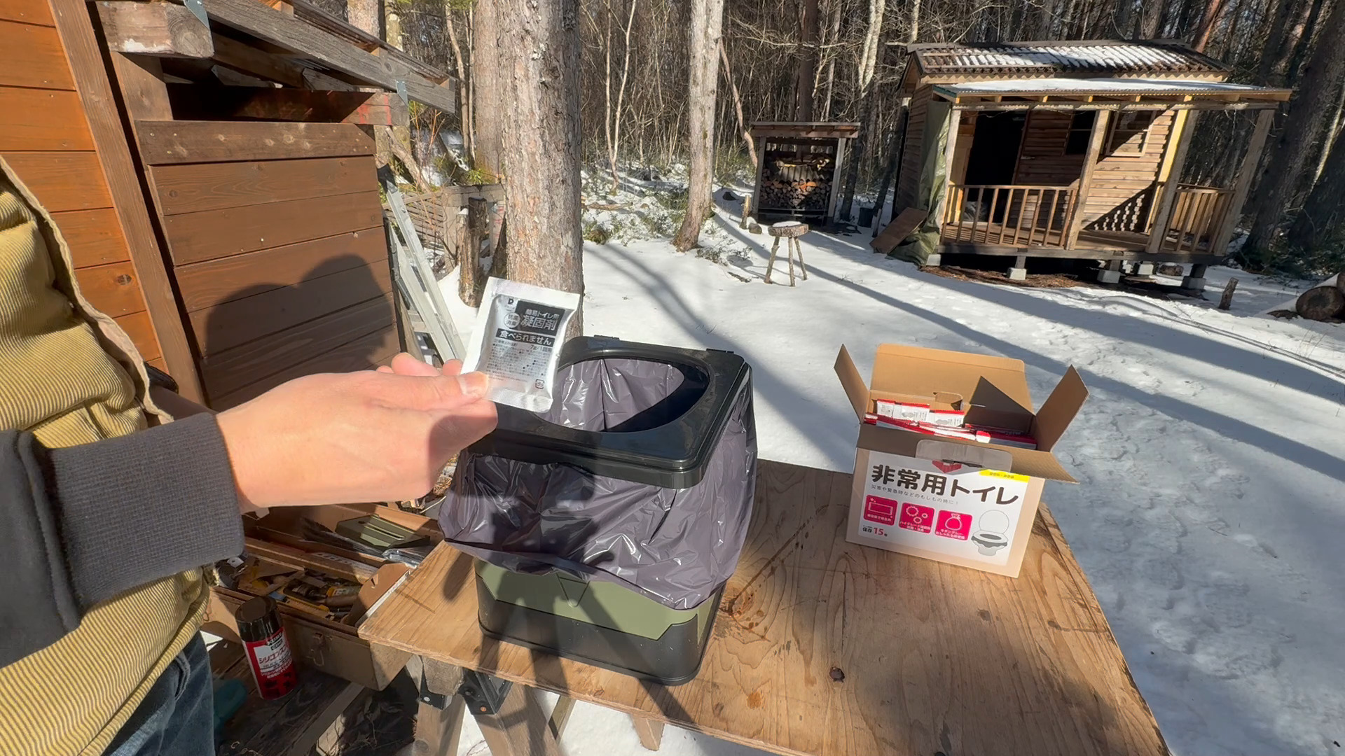 用を足したらこの凝固剤を振りかけて袋を縛って可燃ゴミに廃棄します。