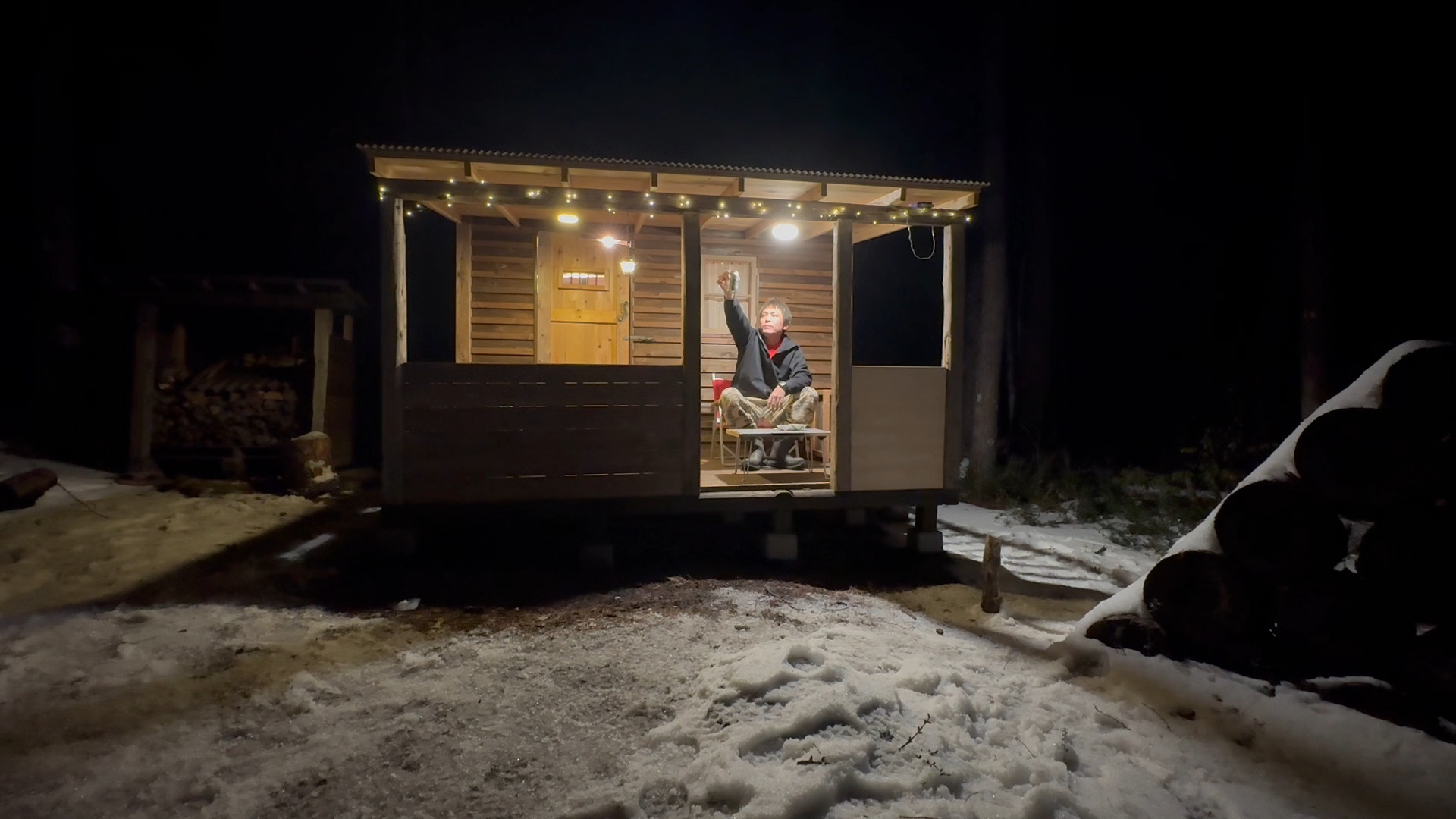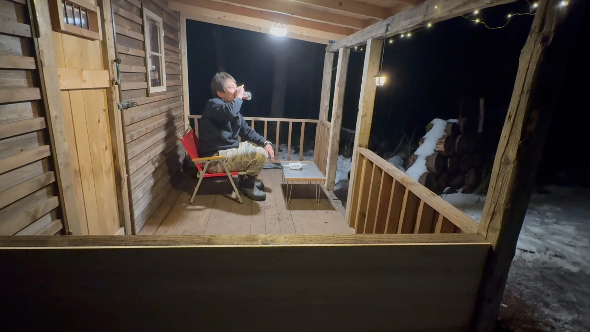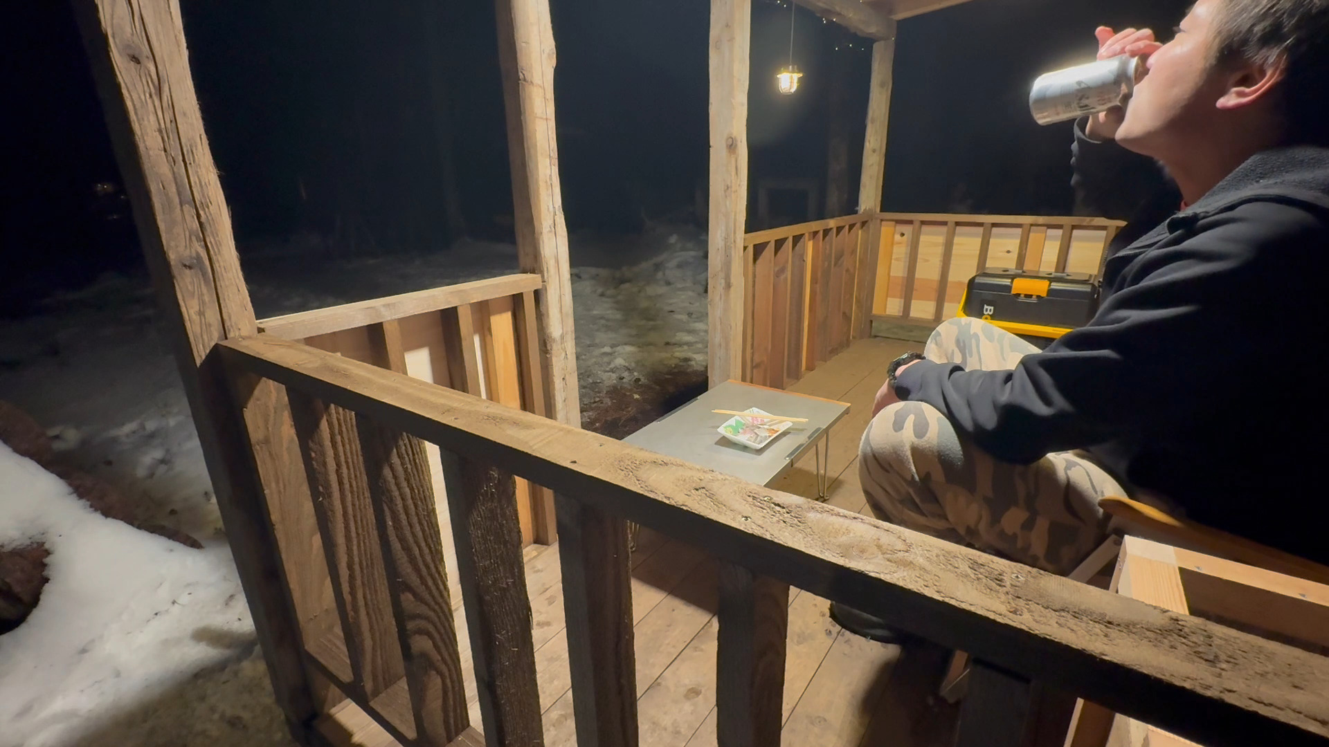 自作の山小屋の屋根付きデッキでビールとか最高ですね。