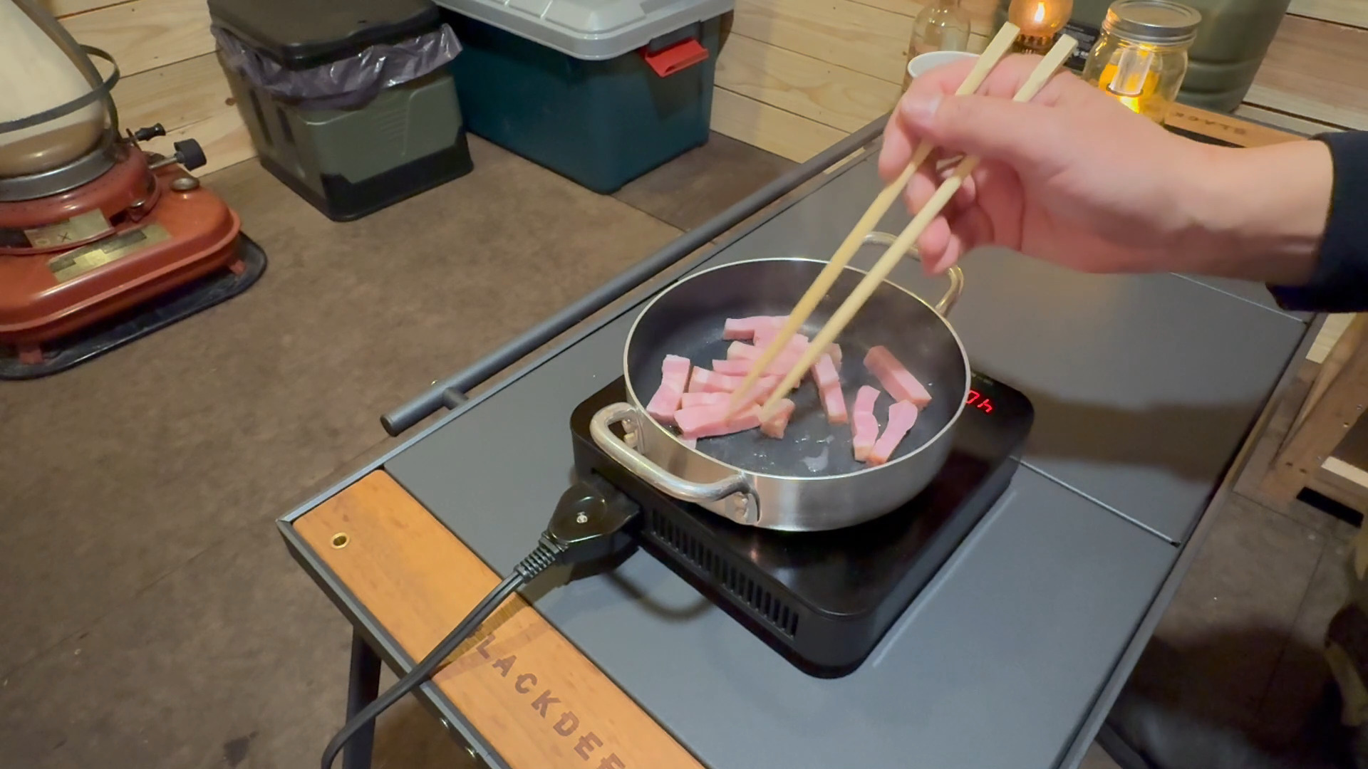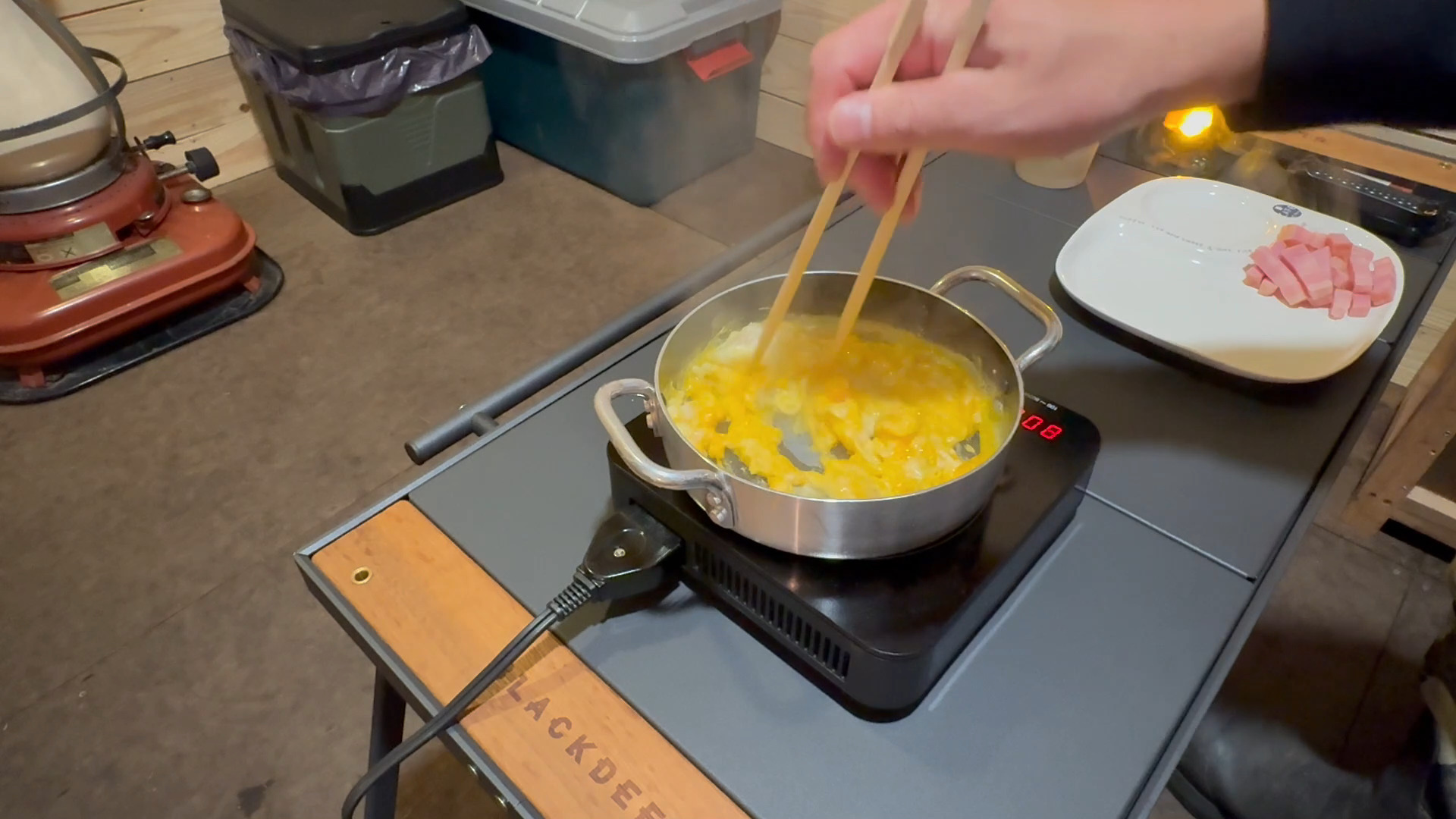 ベーコン焼いて卵を混ぜ混ぜ