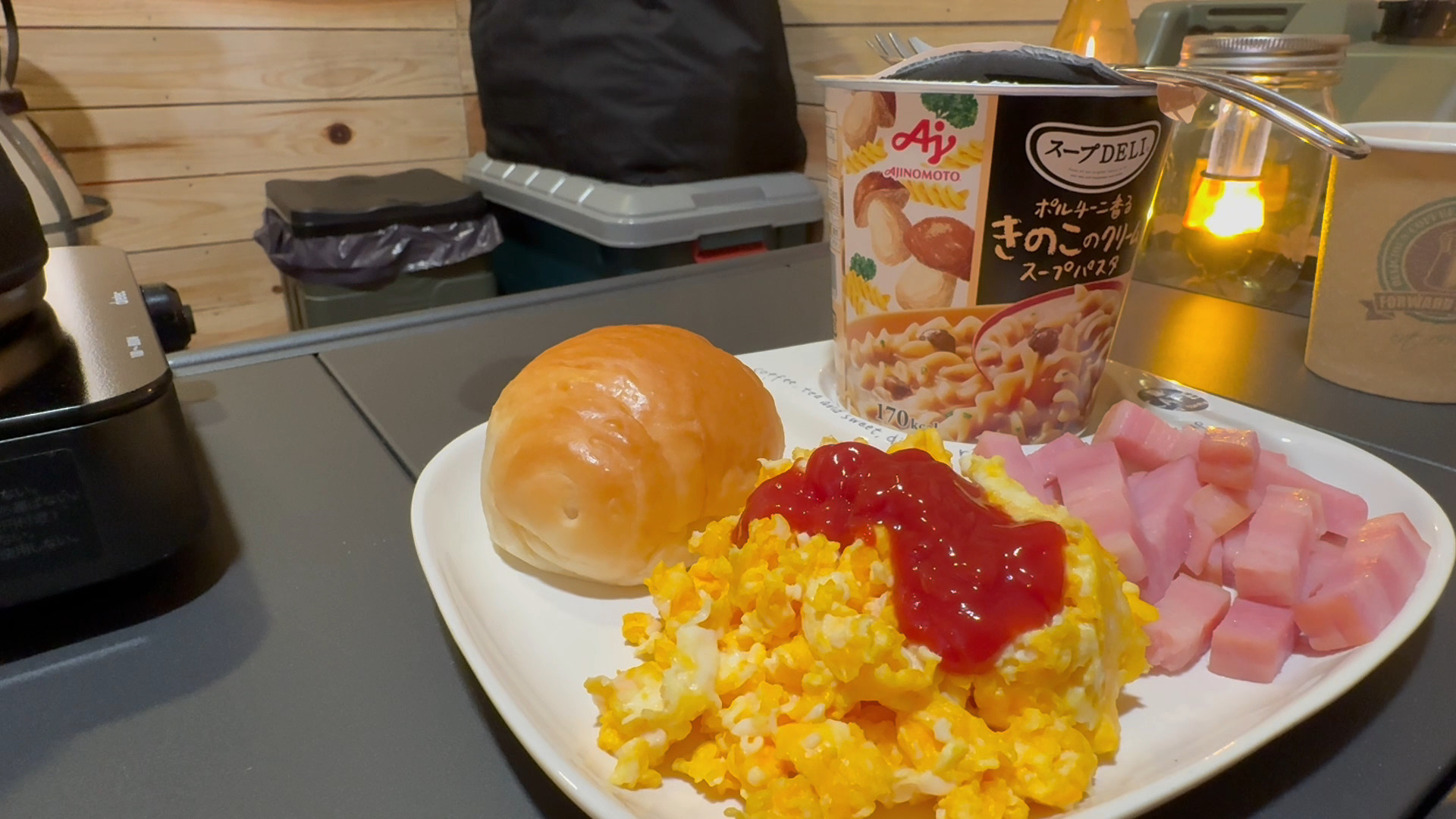 スープパスタとロールパンを添えて朝食の完成です。