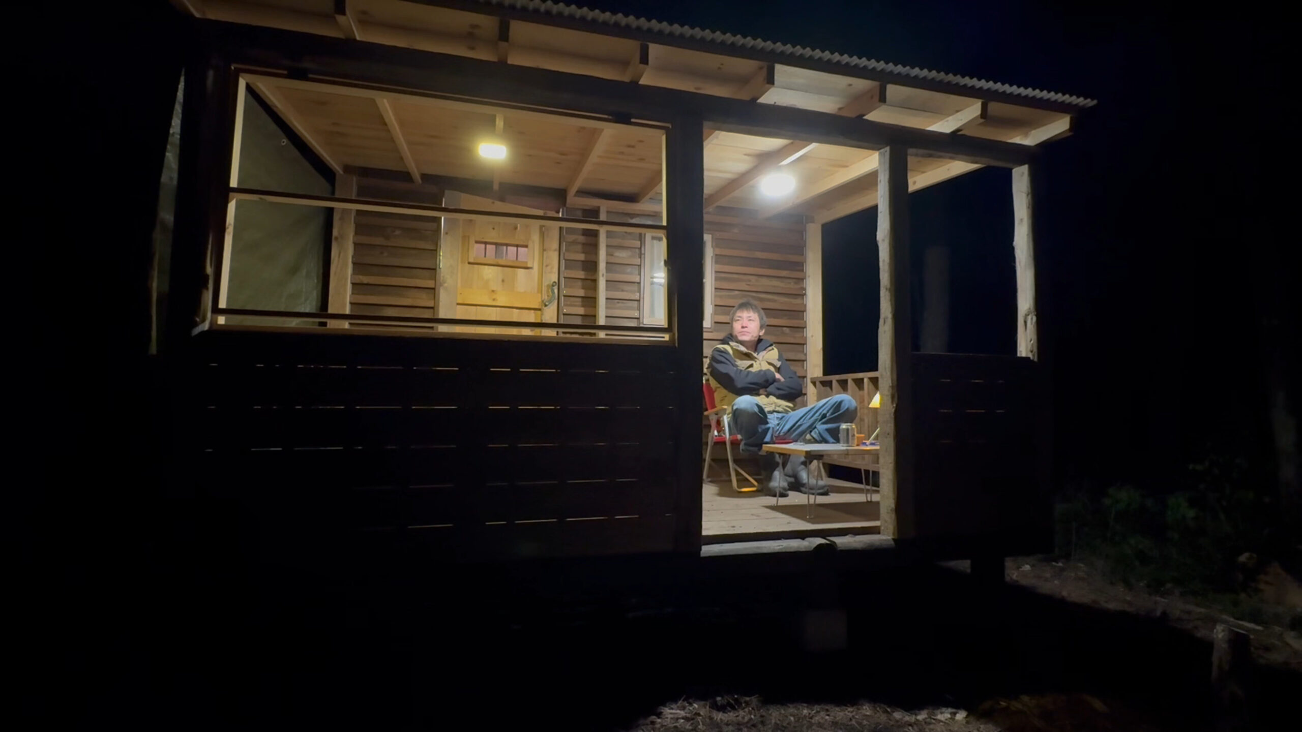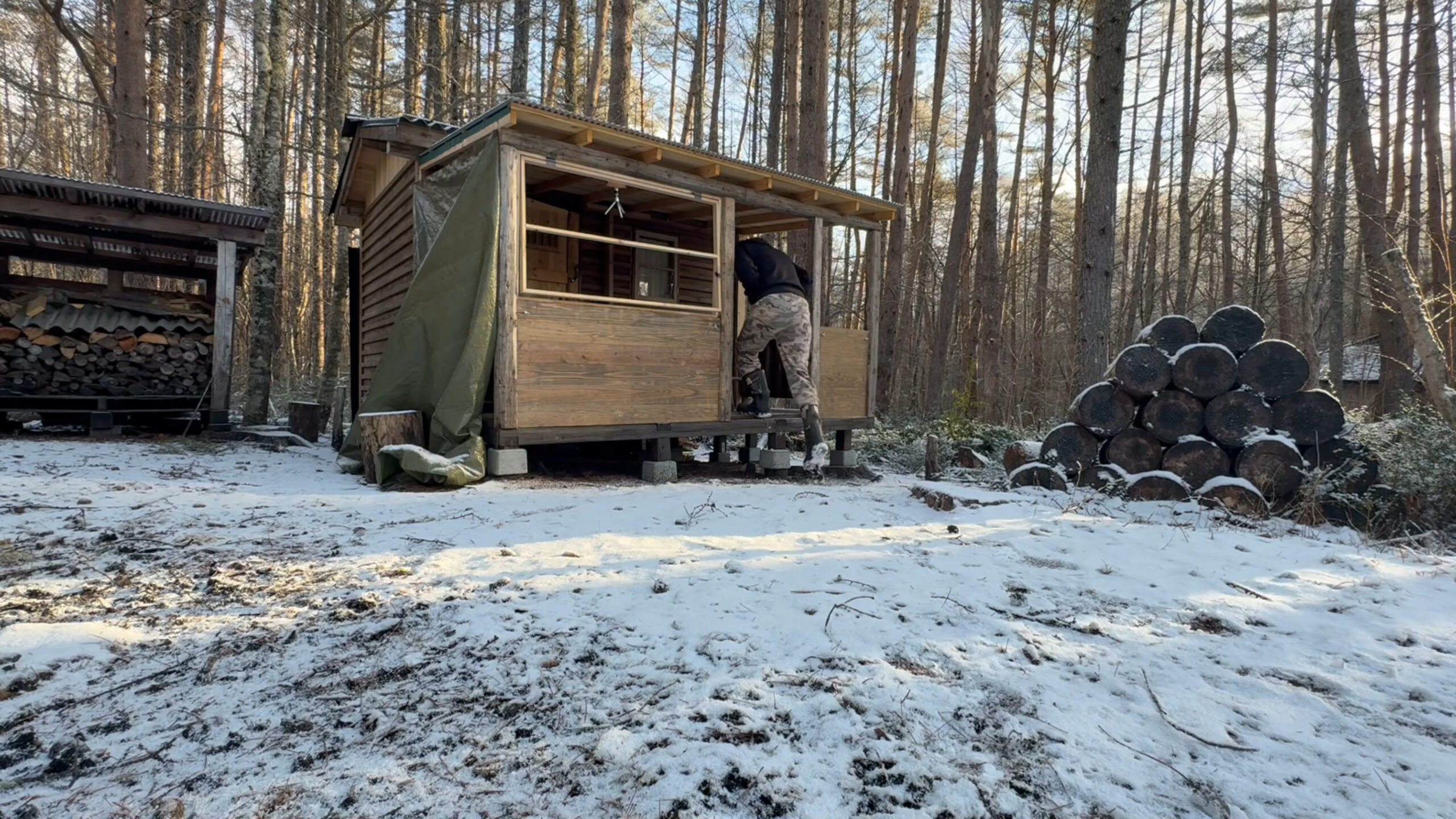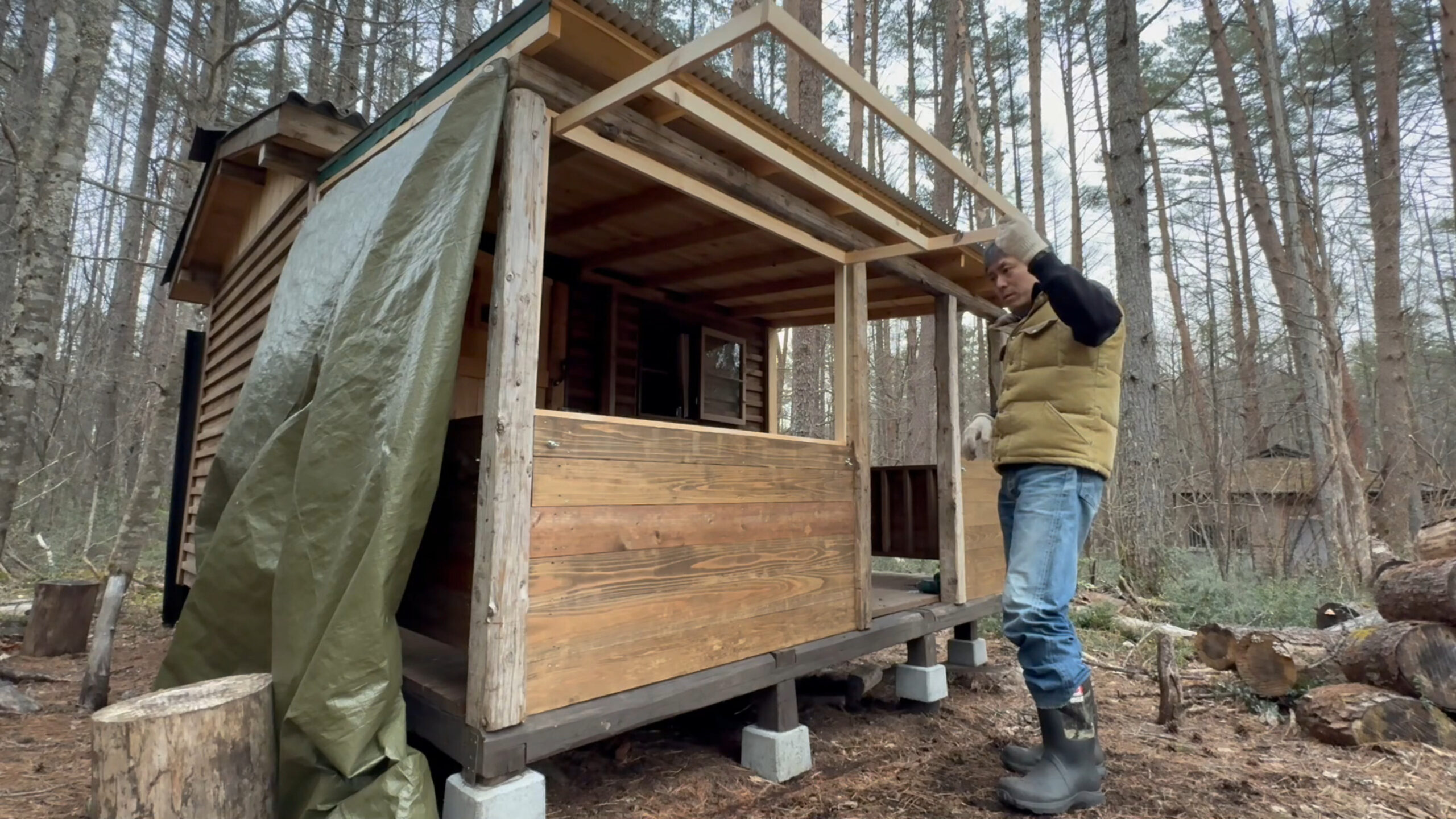 今、自作山小屋の屋根付きデッキに冬用のカバー、窓的な物を施工しています。