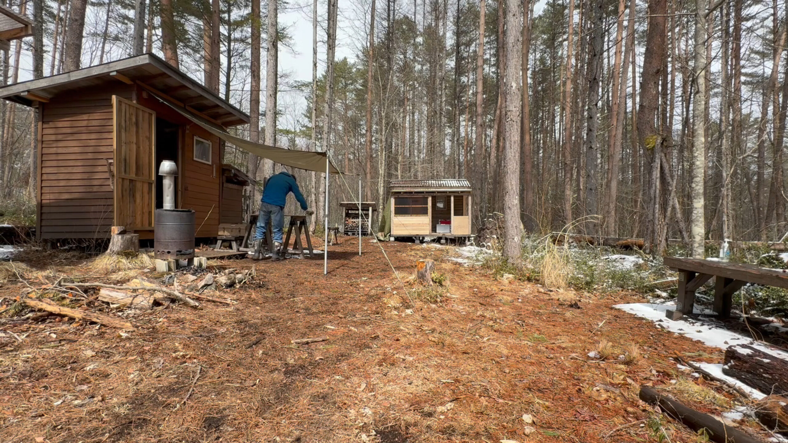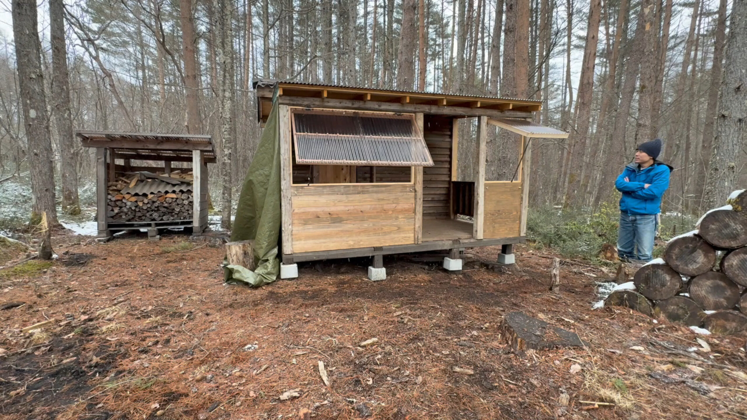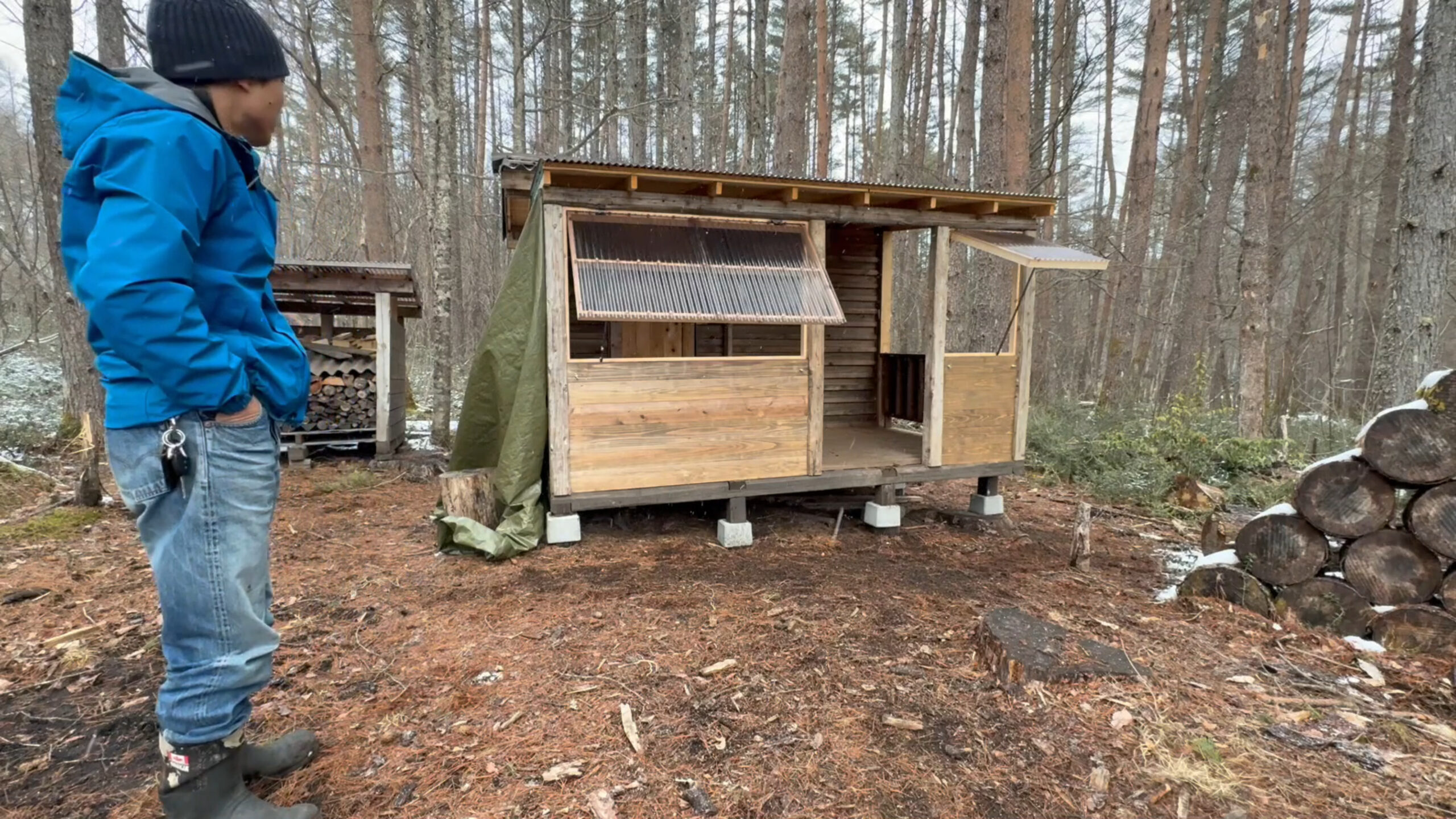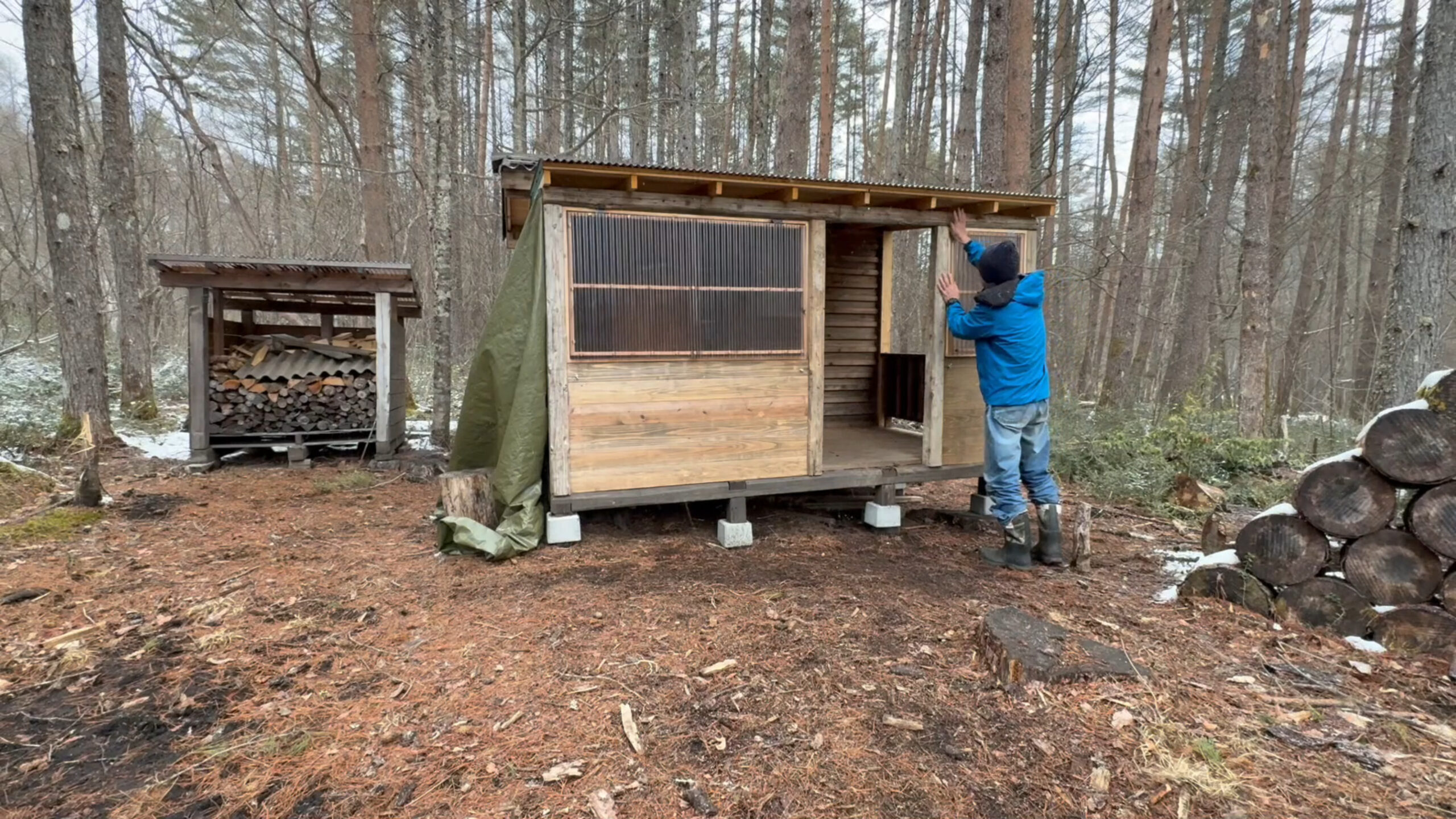 2020年の8月に開拓をスタートして、物置小屋、薪棚、雨水貯水システム、そして寝泊まり出来る小さな小さな山小屋を建てました。
