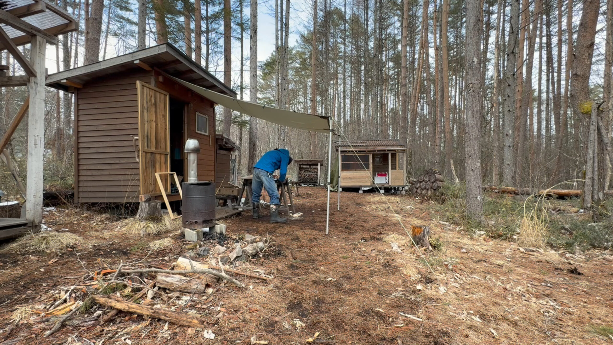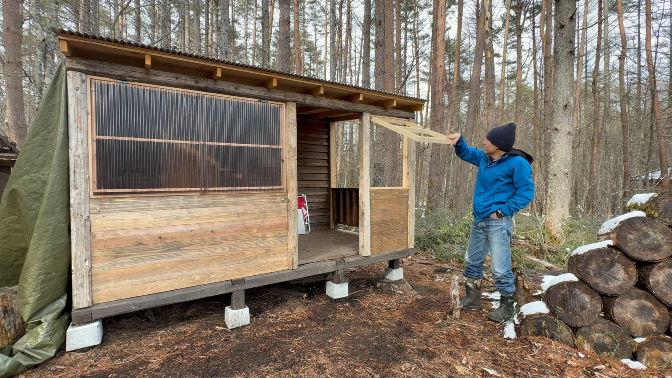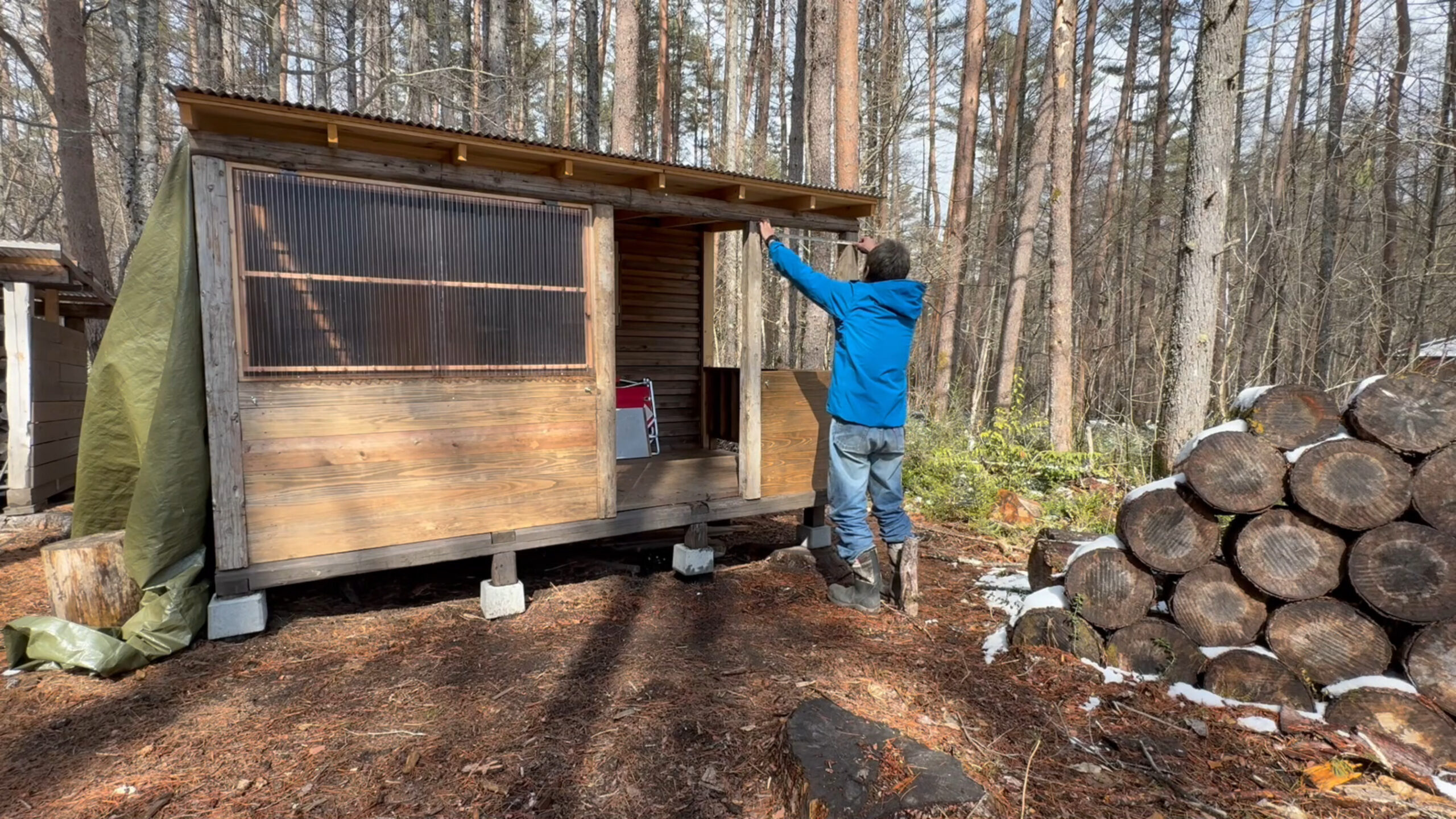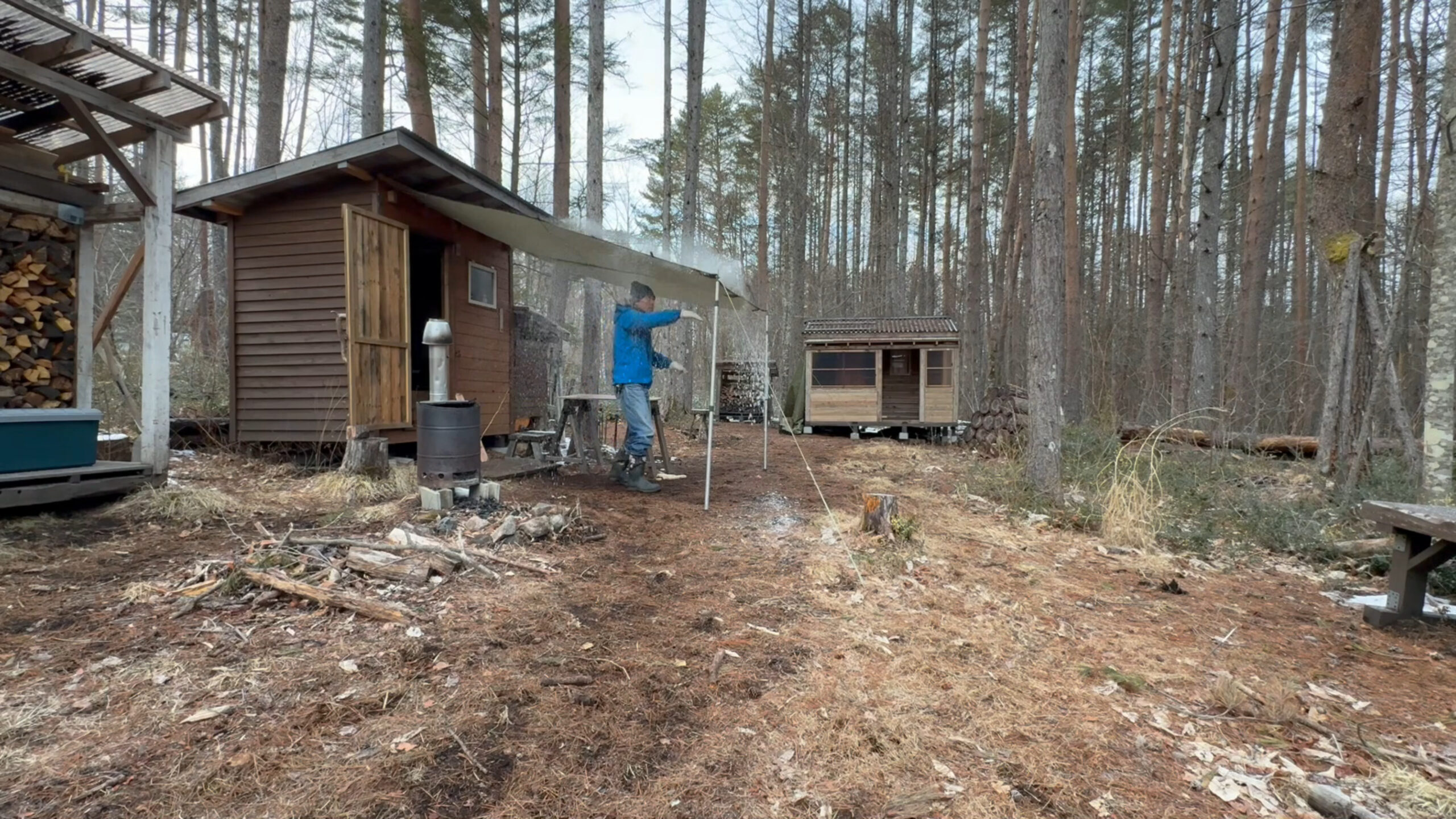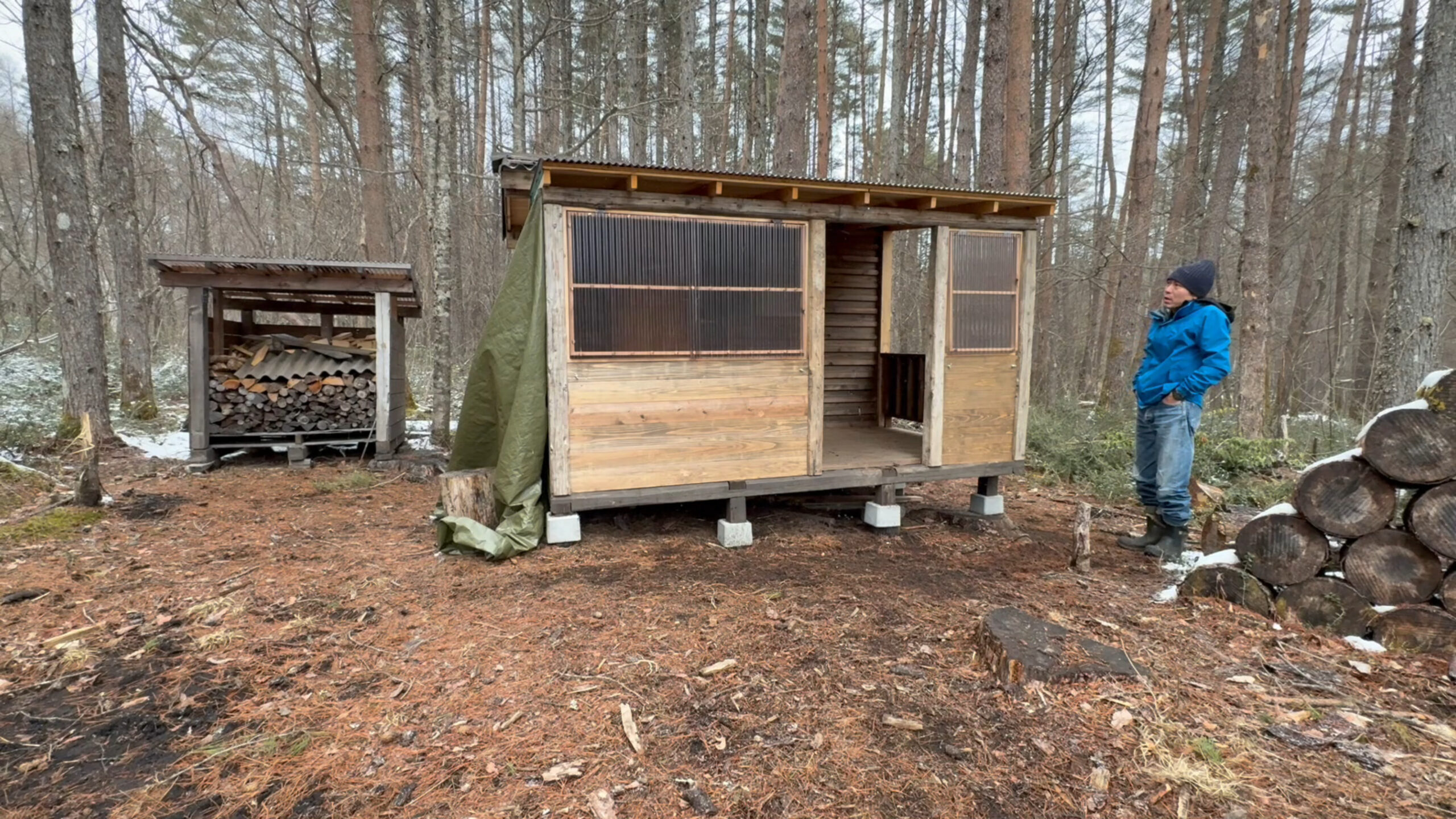 2020年の8月に開拓をスタートして、物置小屋、薪棚、雨水貯水システム、そして寝泊まり出来る小さな小さな山小屋を建てました。