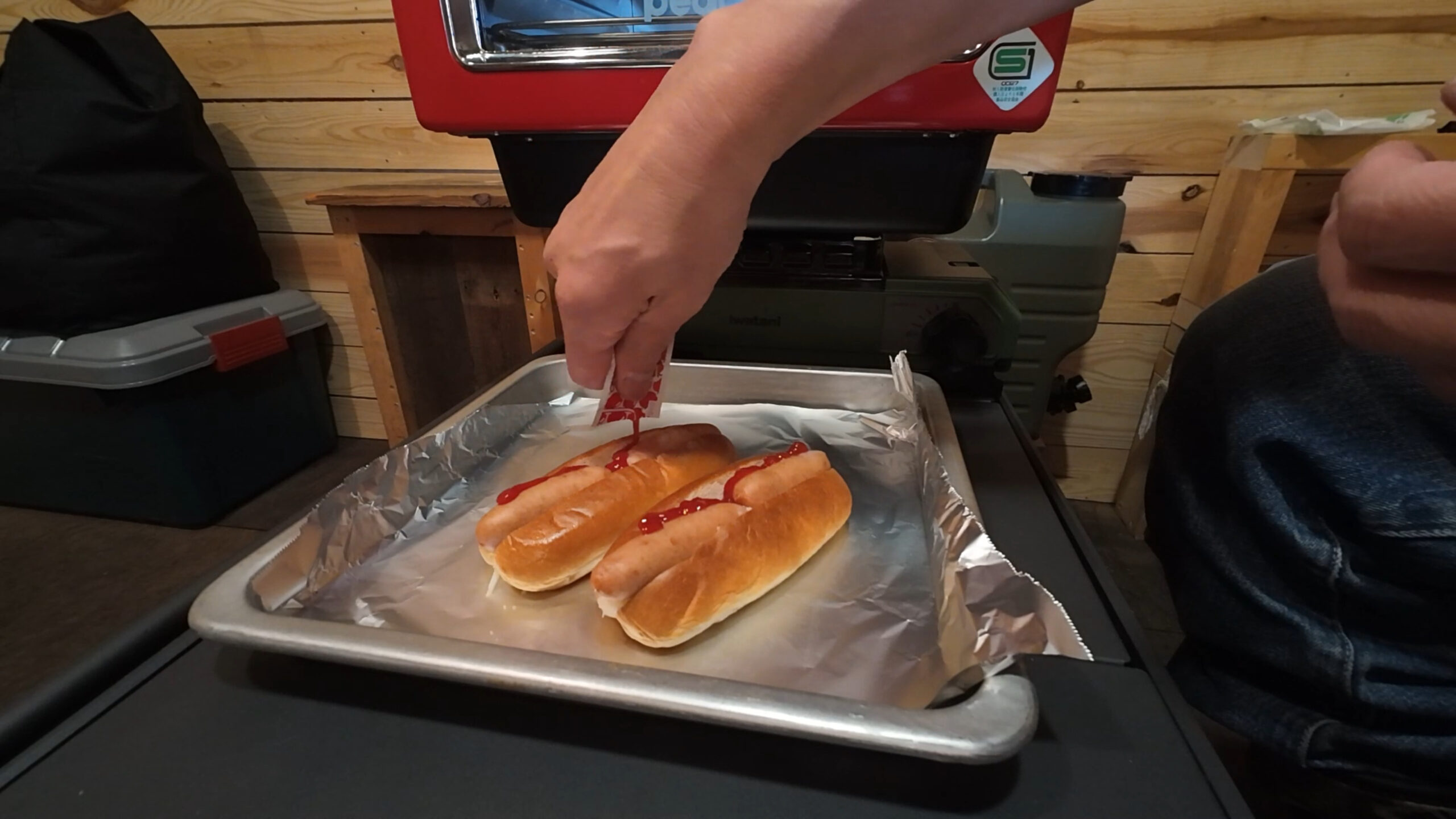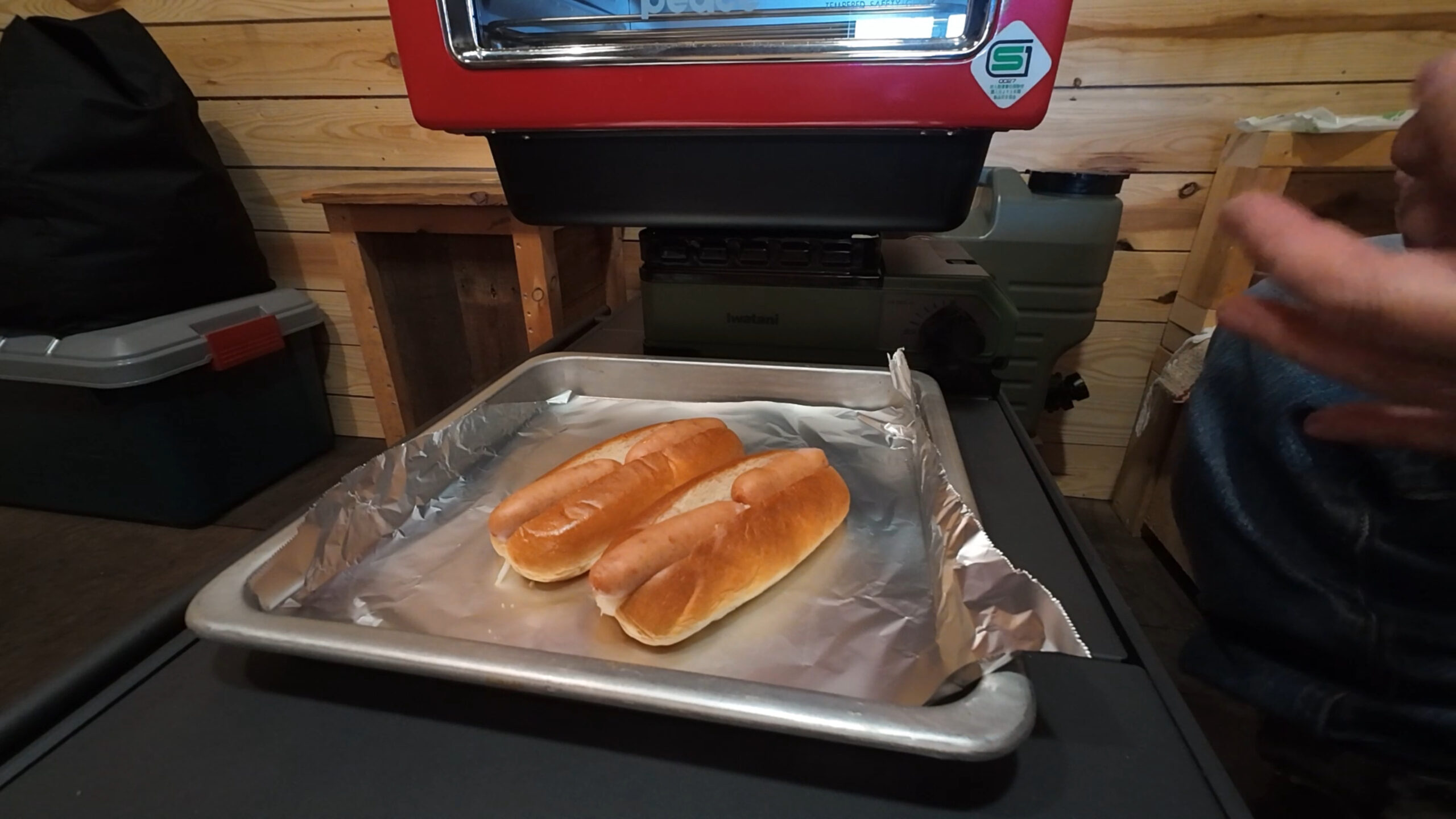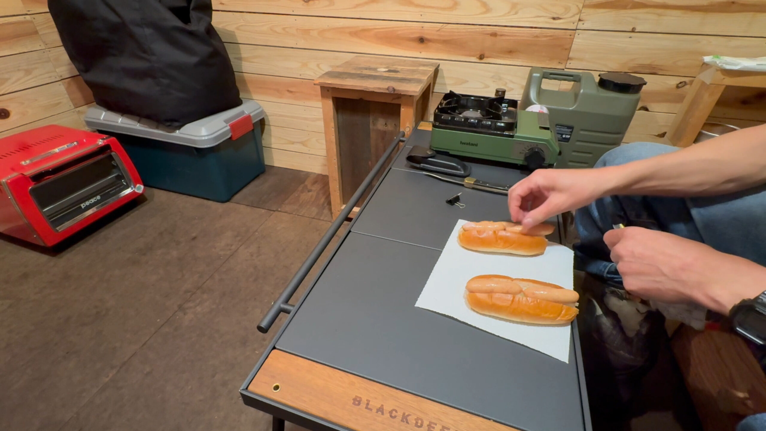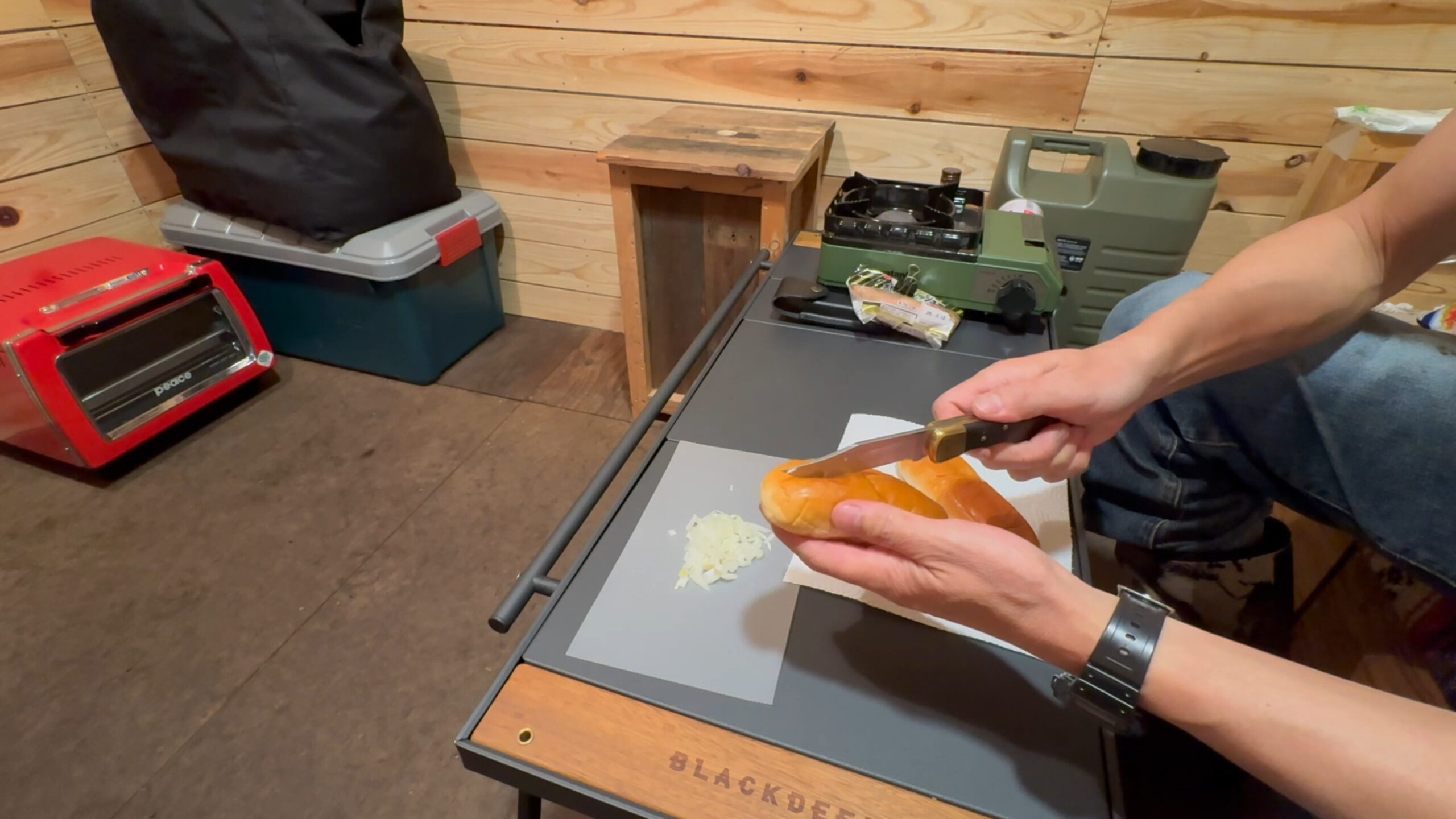 パンに切れ目を入れてオニオンとウインナーを挟んで焼いていきます。