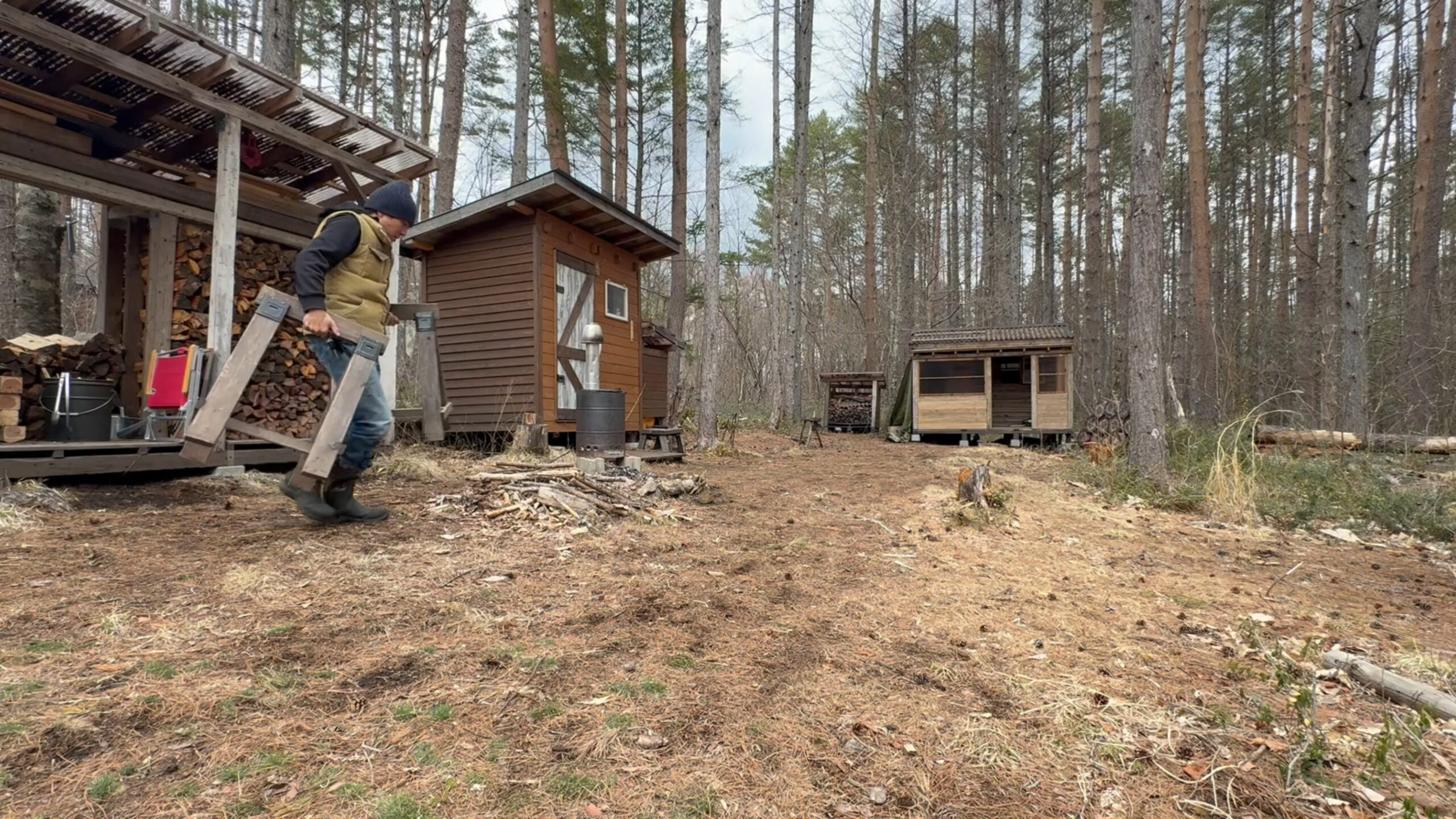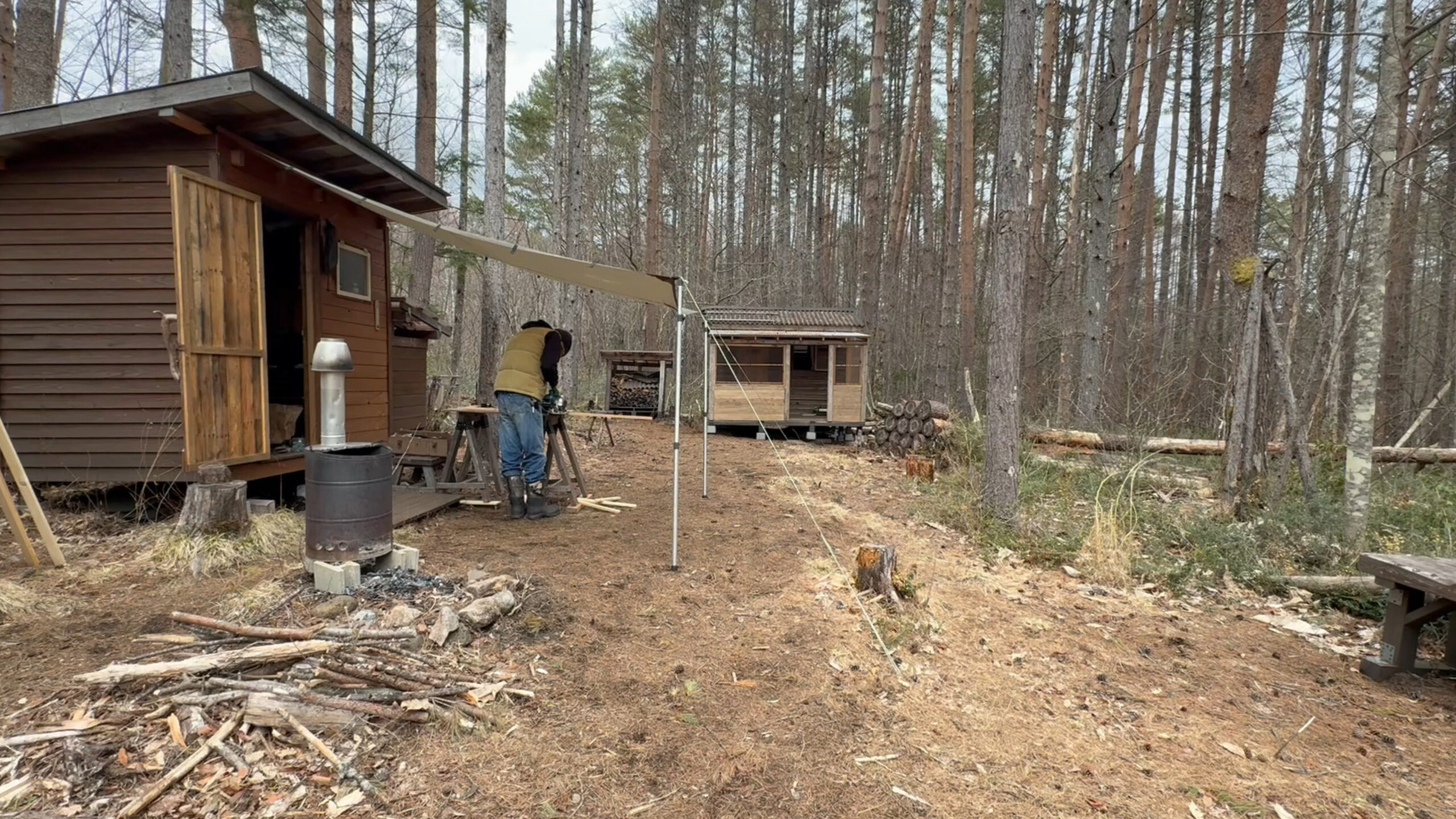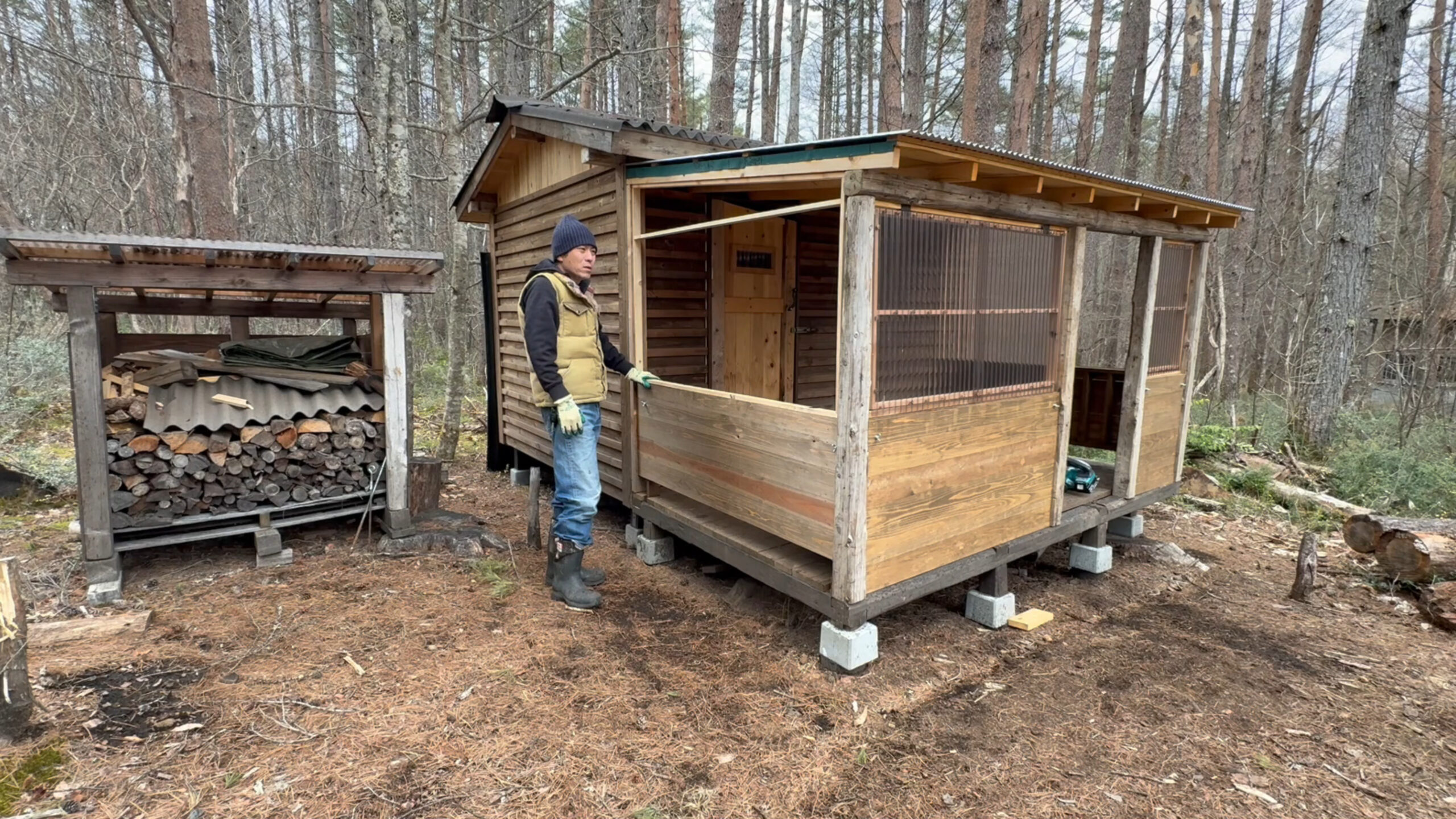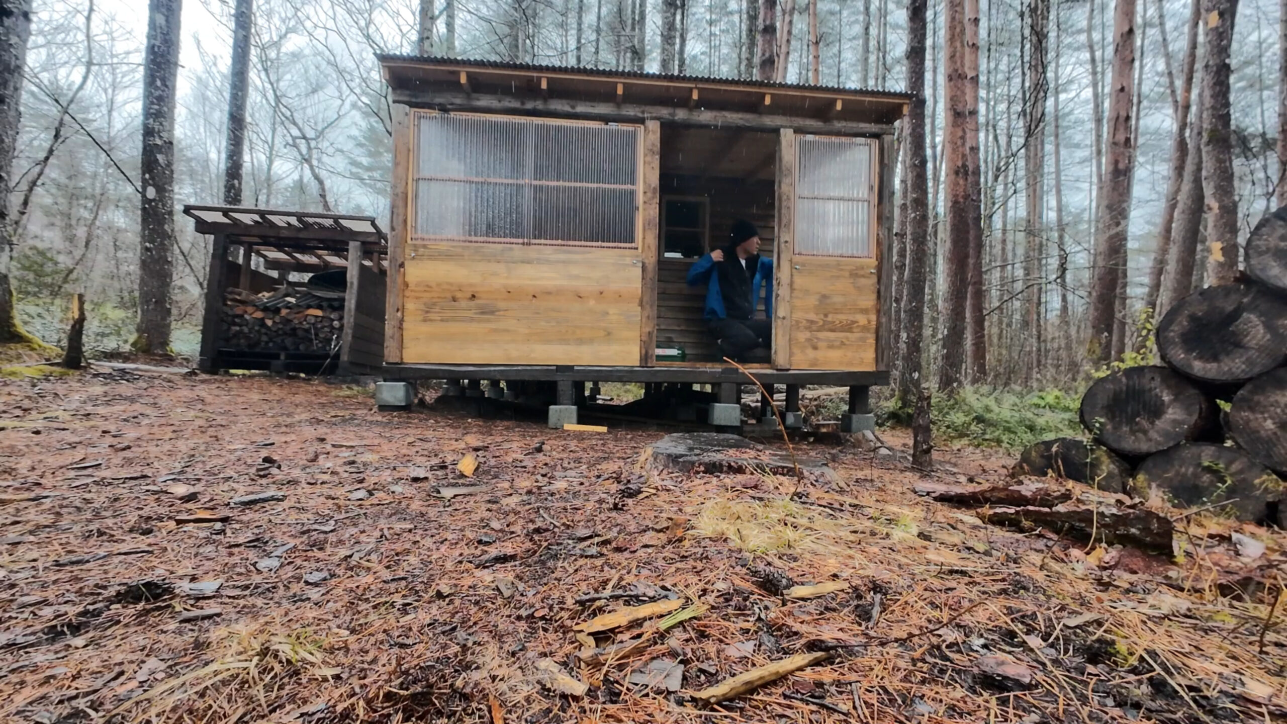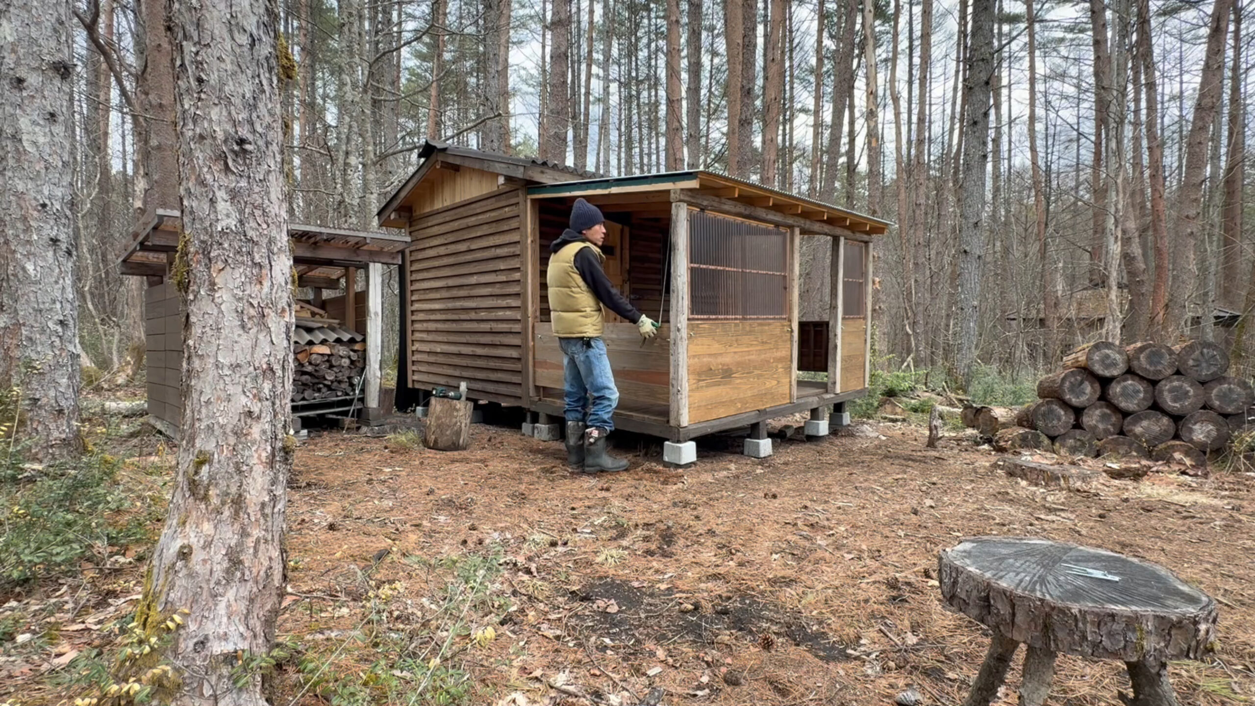 2020年の8月に開拓をスタートして、物置小屋、薪棚、雨水貯水システム、そして寝泊まり出来る小さな小さな山小屋を建てました。