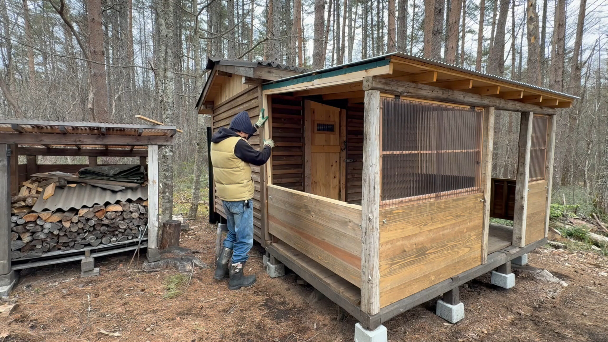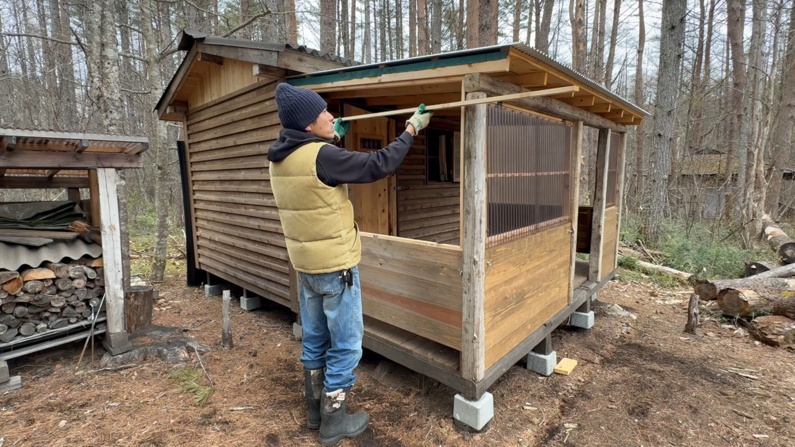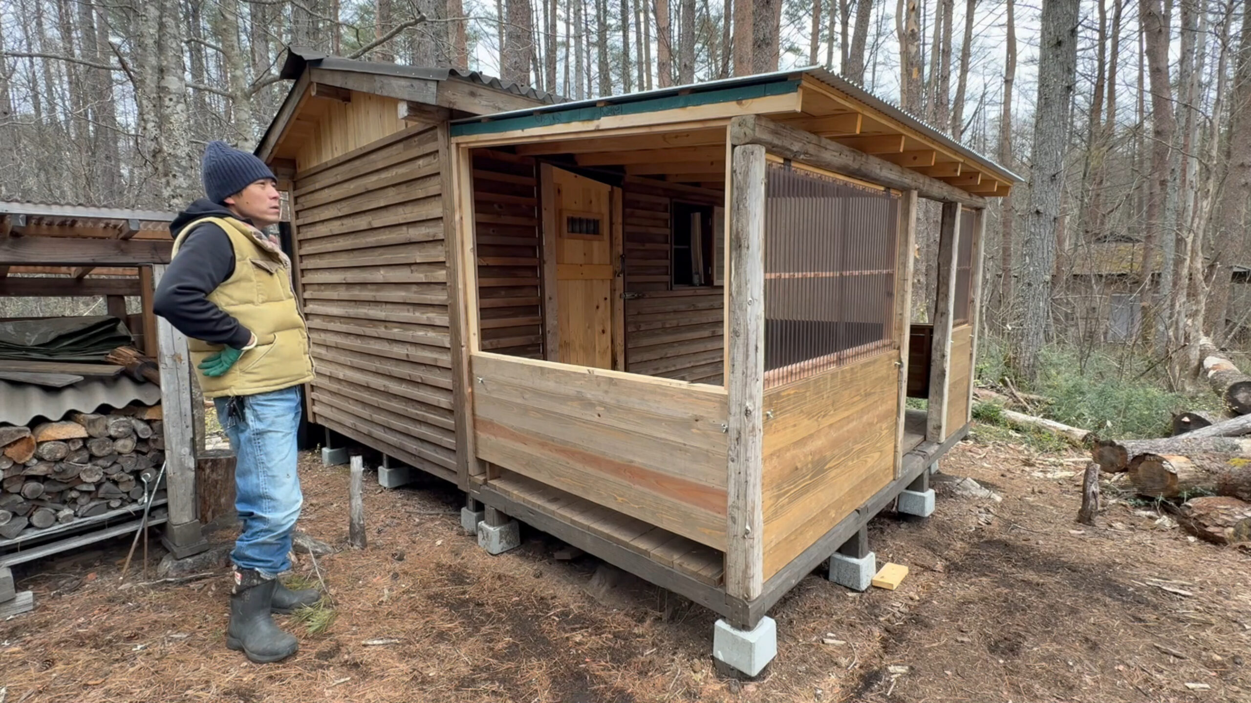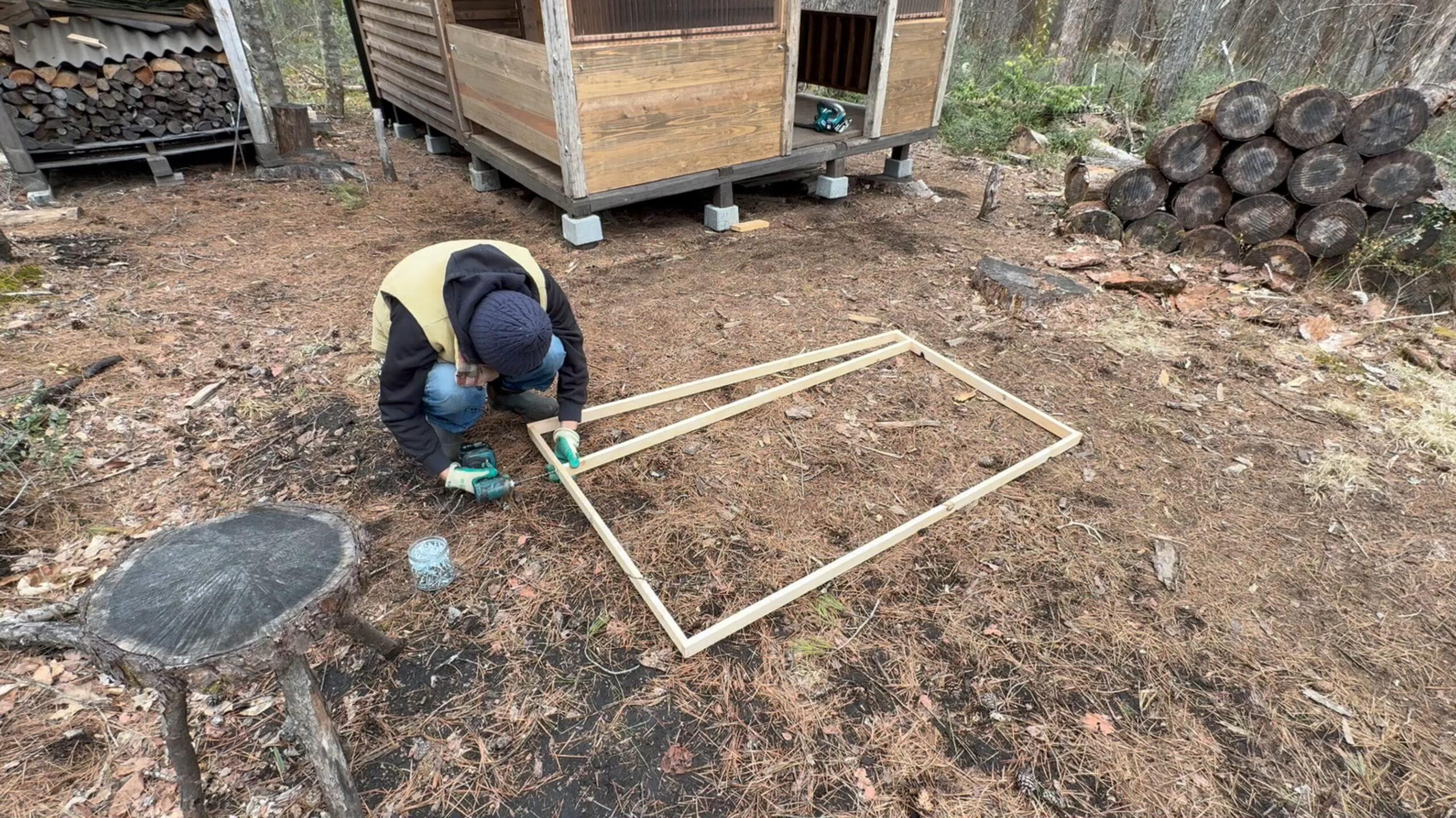 2020年の8月に開拓をスタートして、物置小屋、薪棚、雨水貯水システム、そして寝泊まり出来る小さな小さな山小屋を建てました。