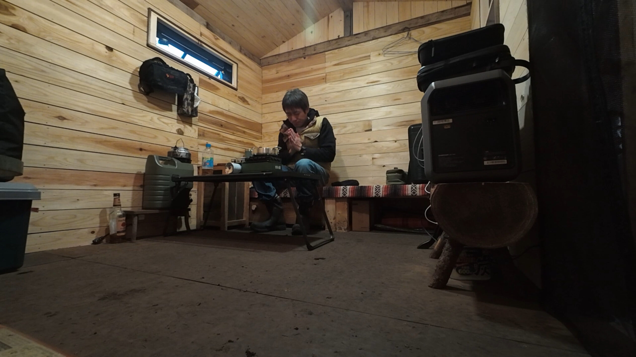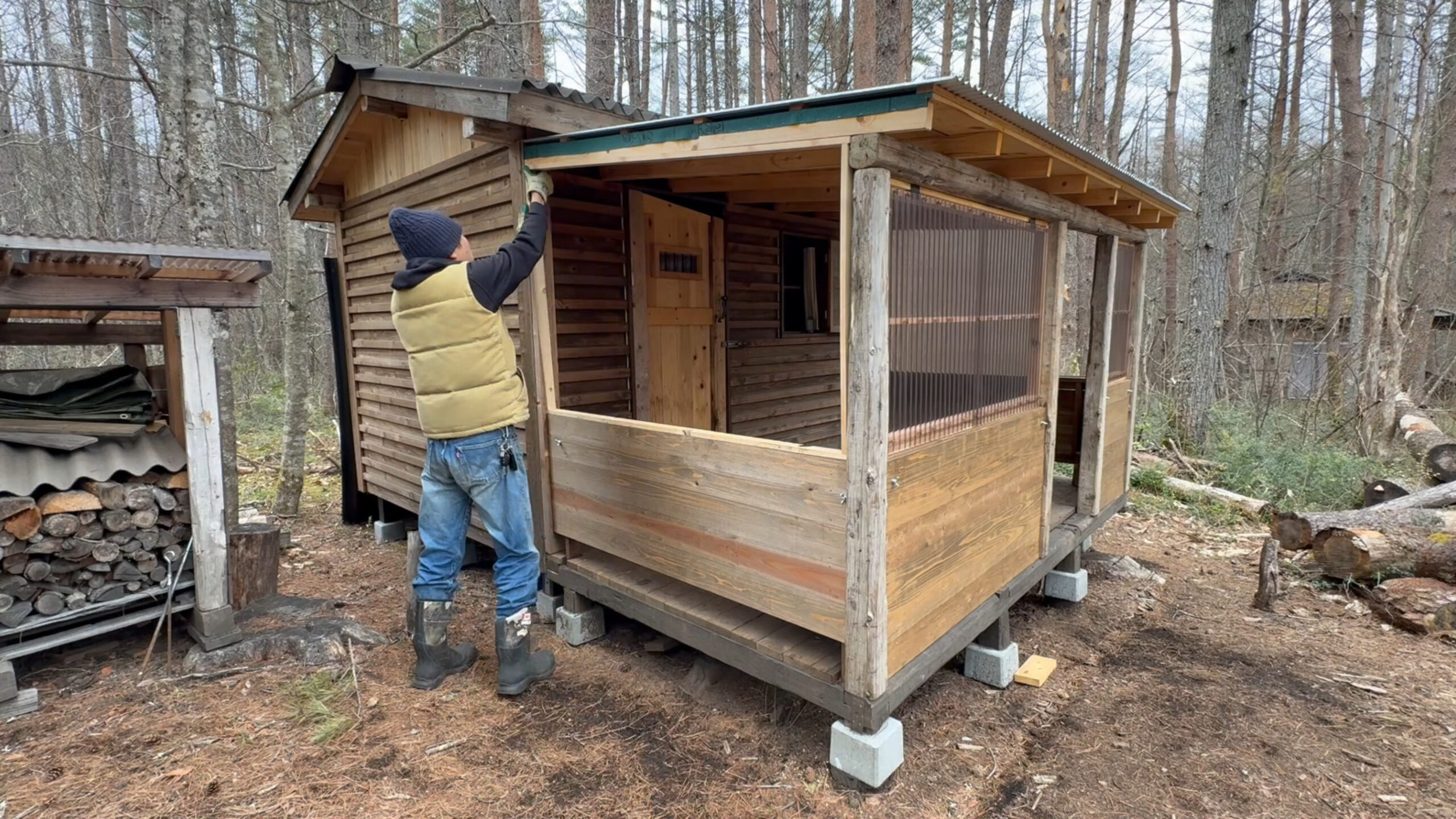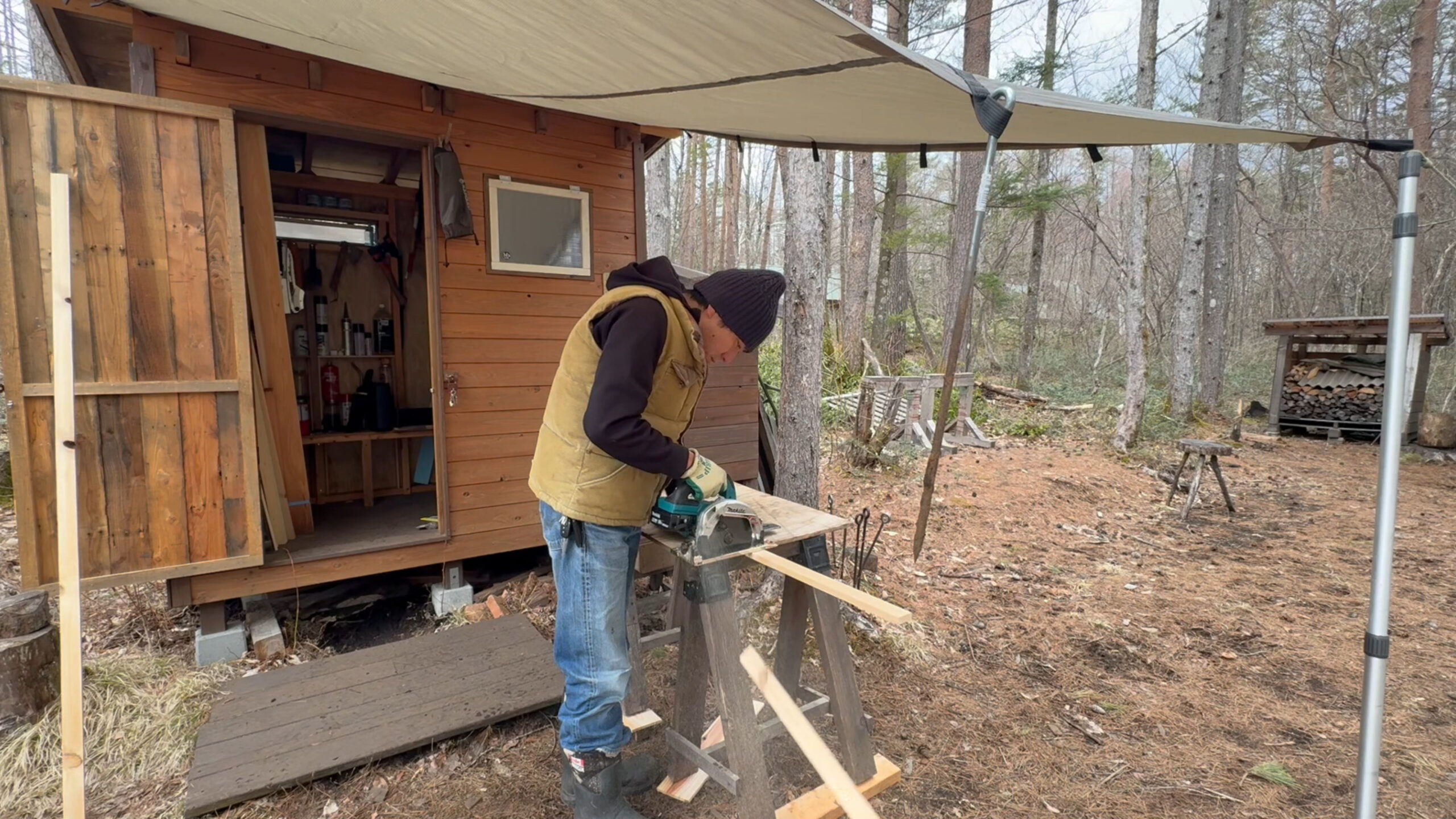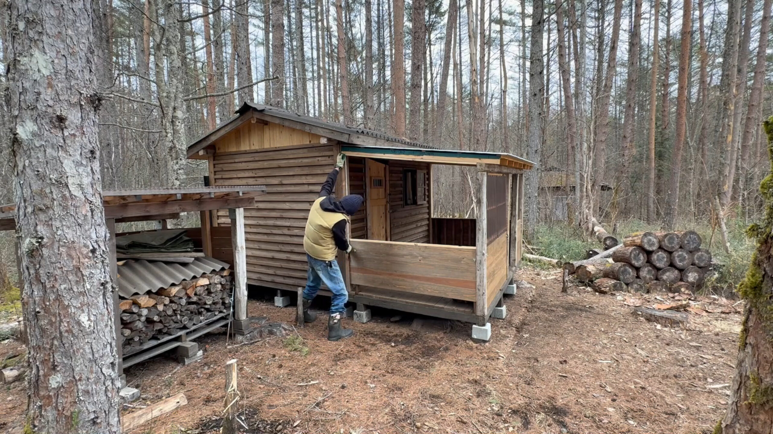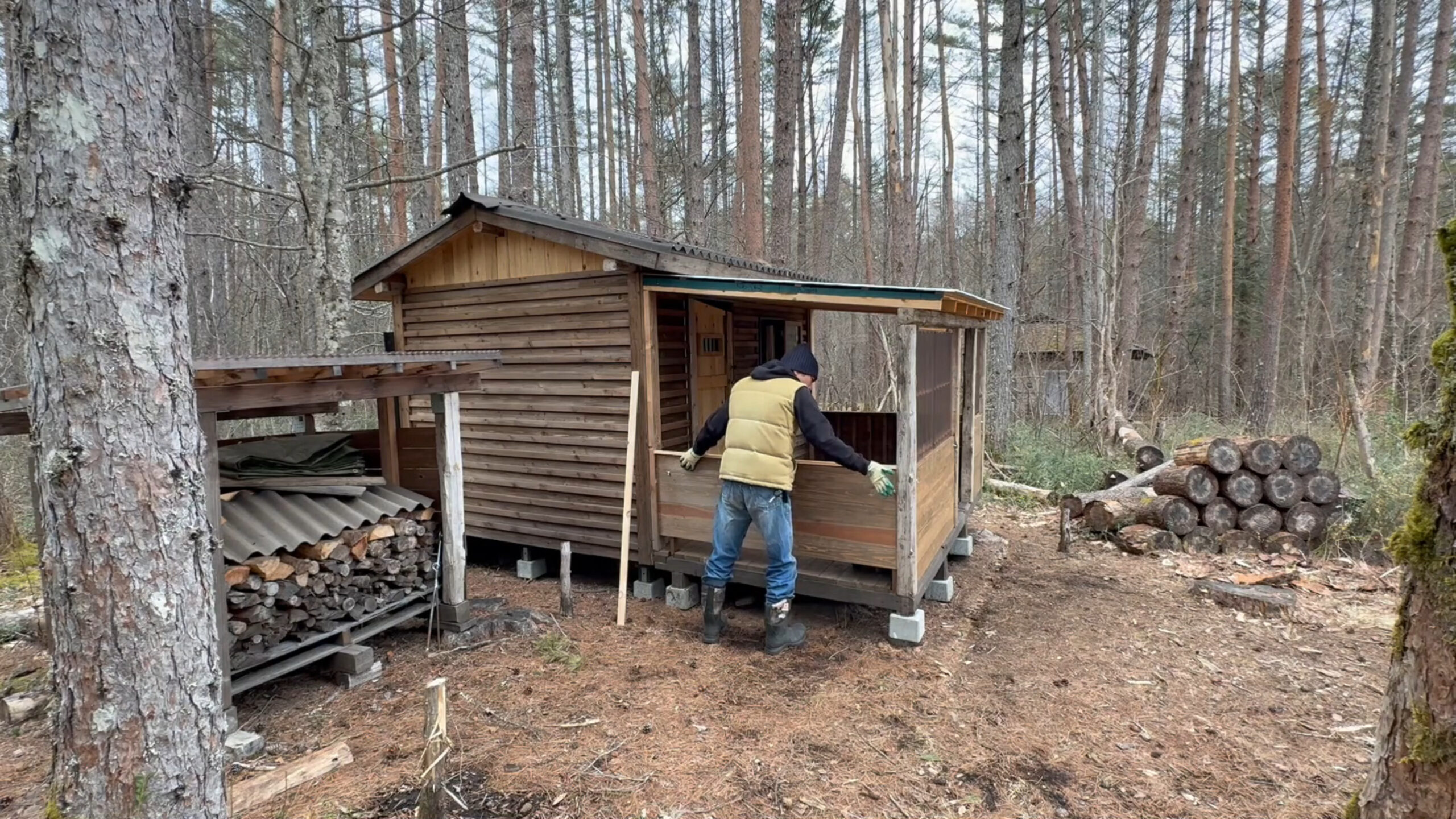2020年の8月に開拓をスタートして、物置小屋、薪棚、雨水貯水システム、そして寝泊まり出来る小さな小さな山小屋を建てました。